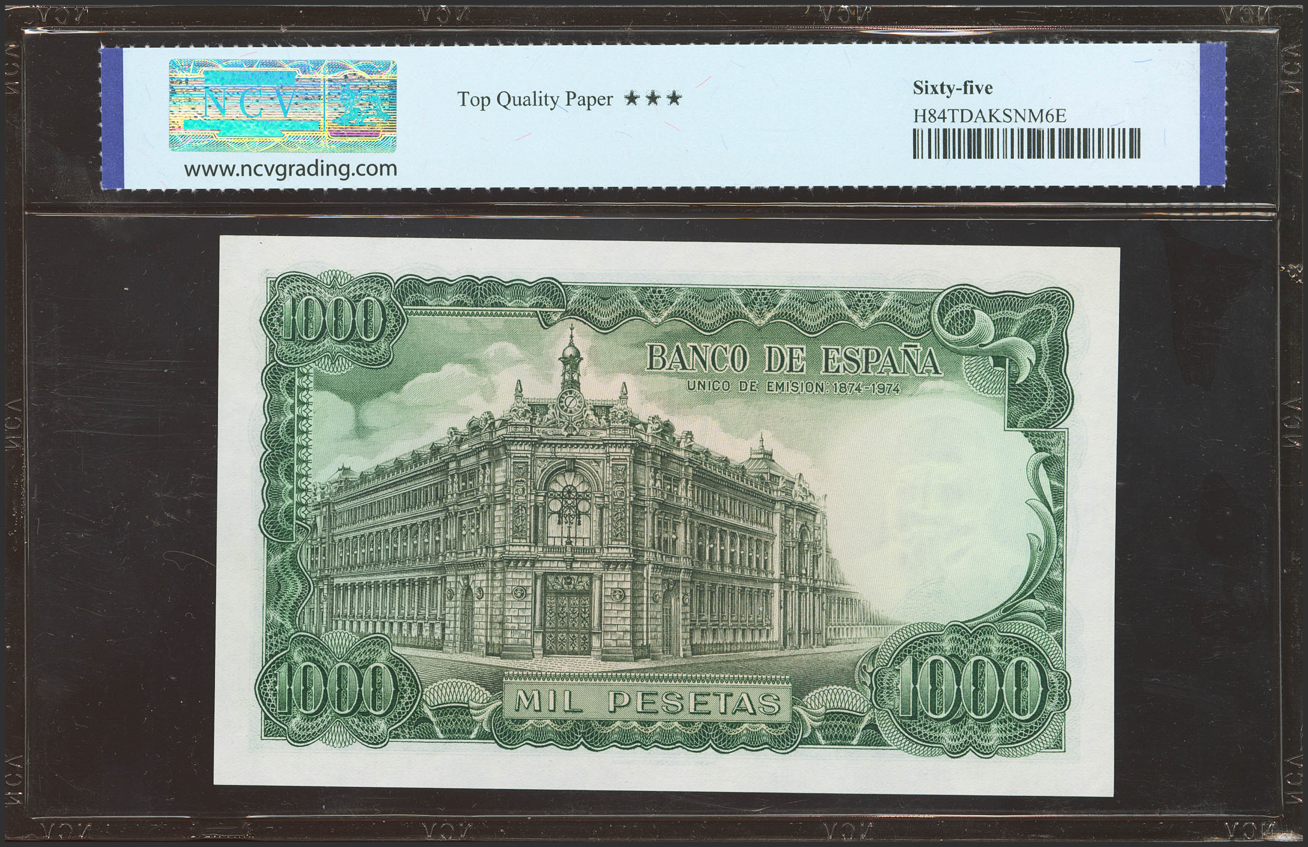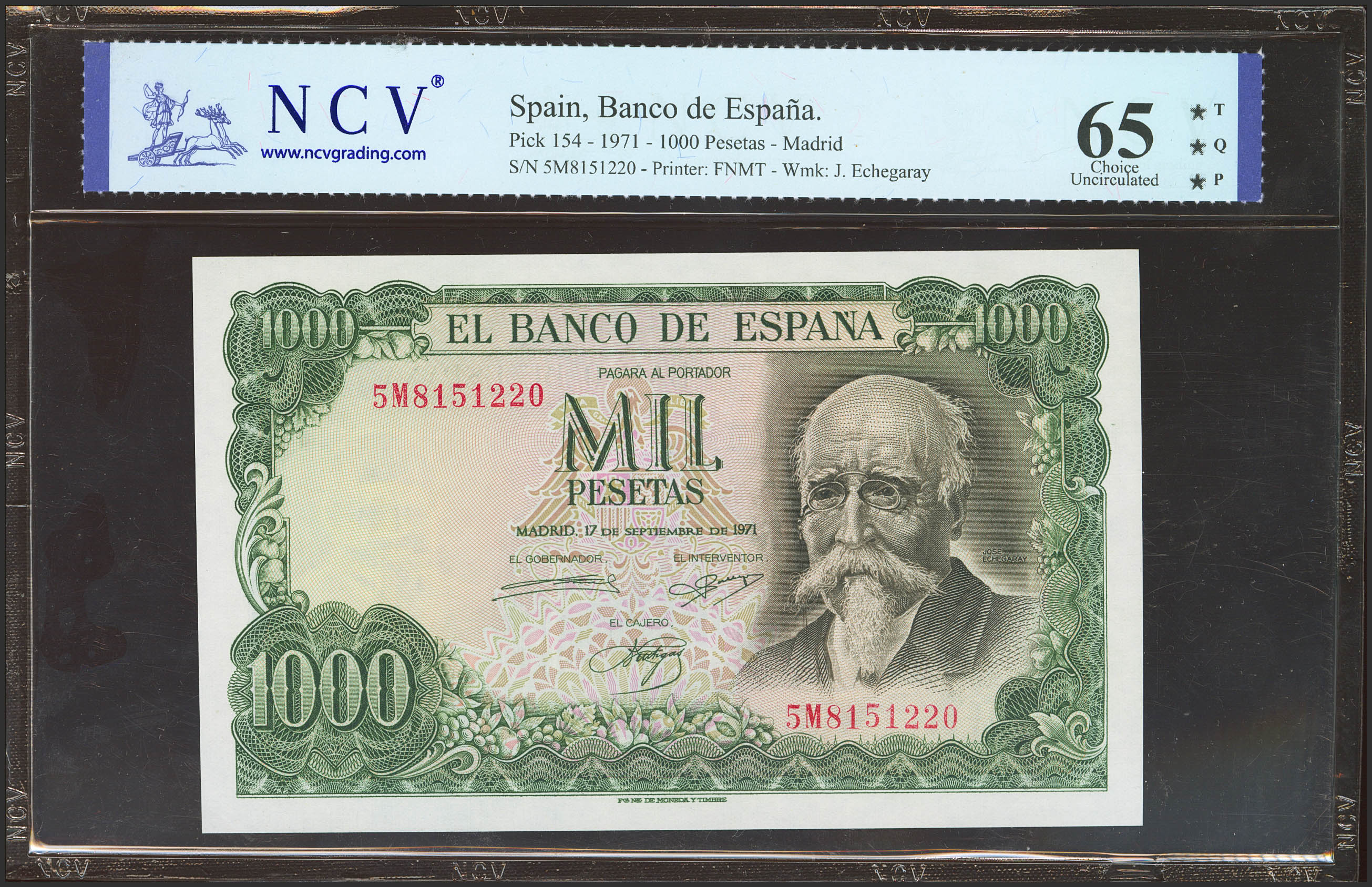 1000 Pesetas. 17 de Septiembre de 1971. Serie 5M. (Edifil 2021: 474c, Pick: 154). Raro en esta excepcional calidad, apresto original. SC. Encapsulado NCV65TQP.