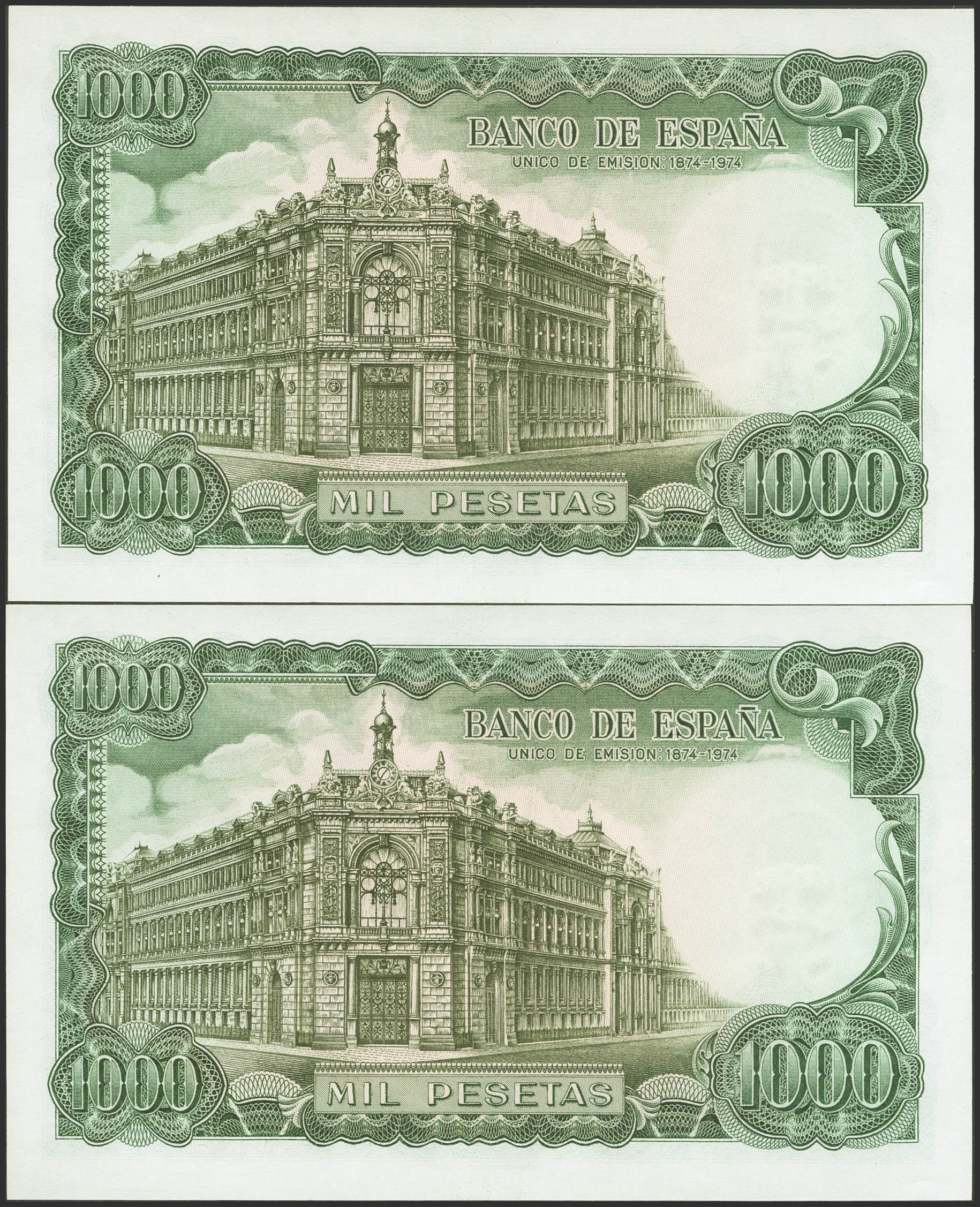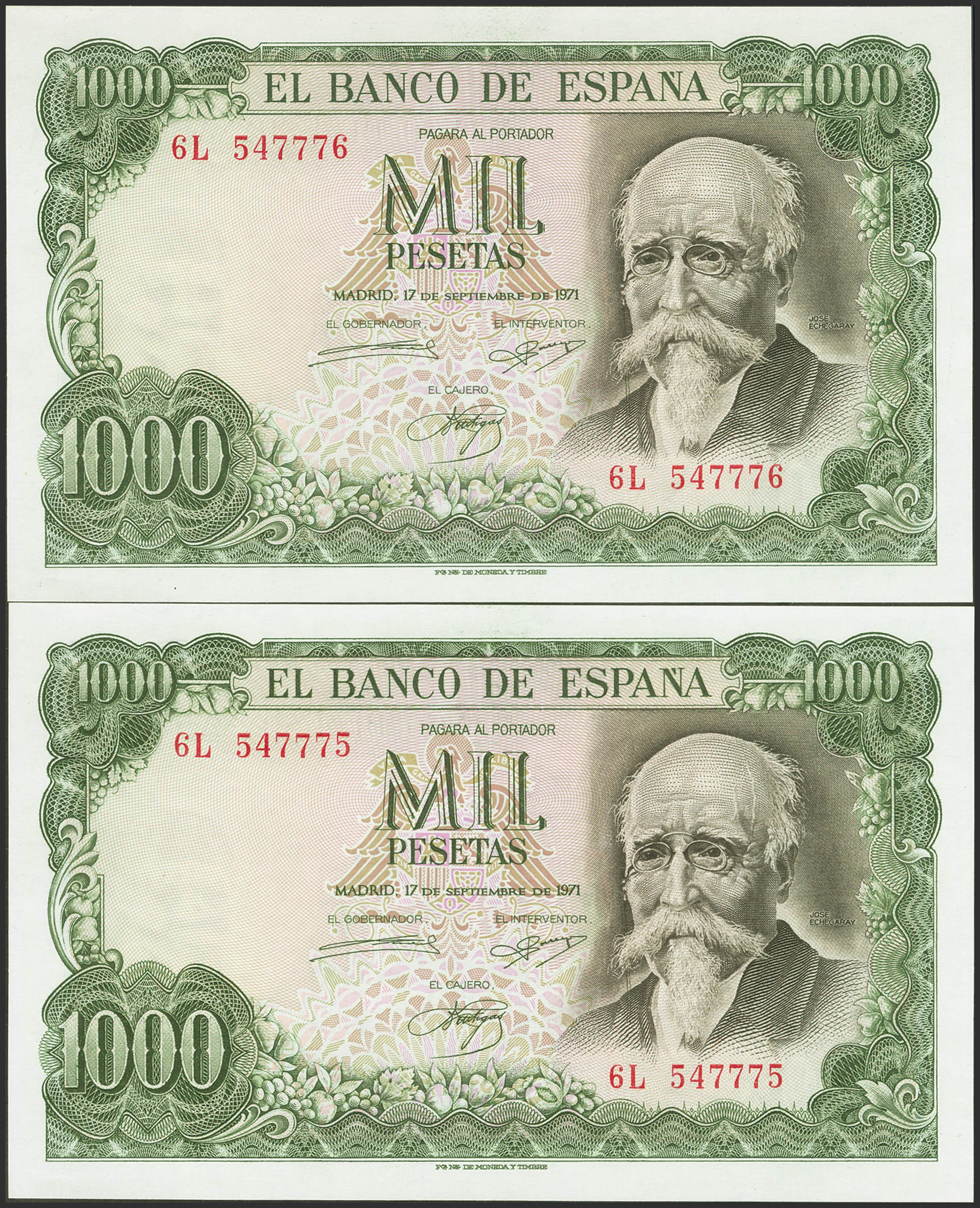 1000 Pesetas. 17 de Septiembre de 1971. Pareja correlativa. Serie 6L. (Edifil 2021: 474c). Conserva todo su apresto original. SC.
