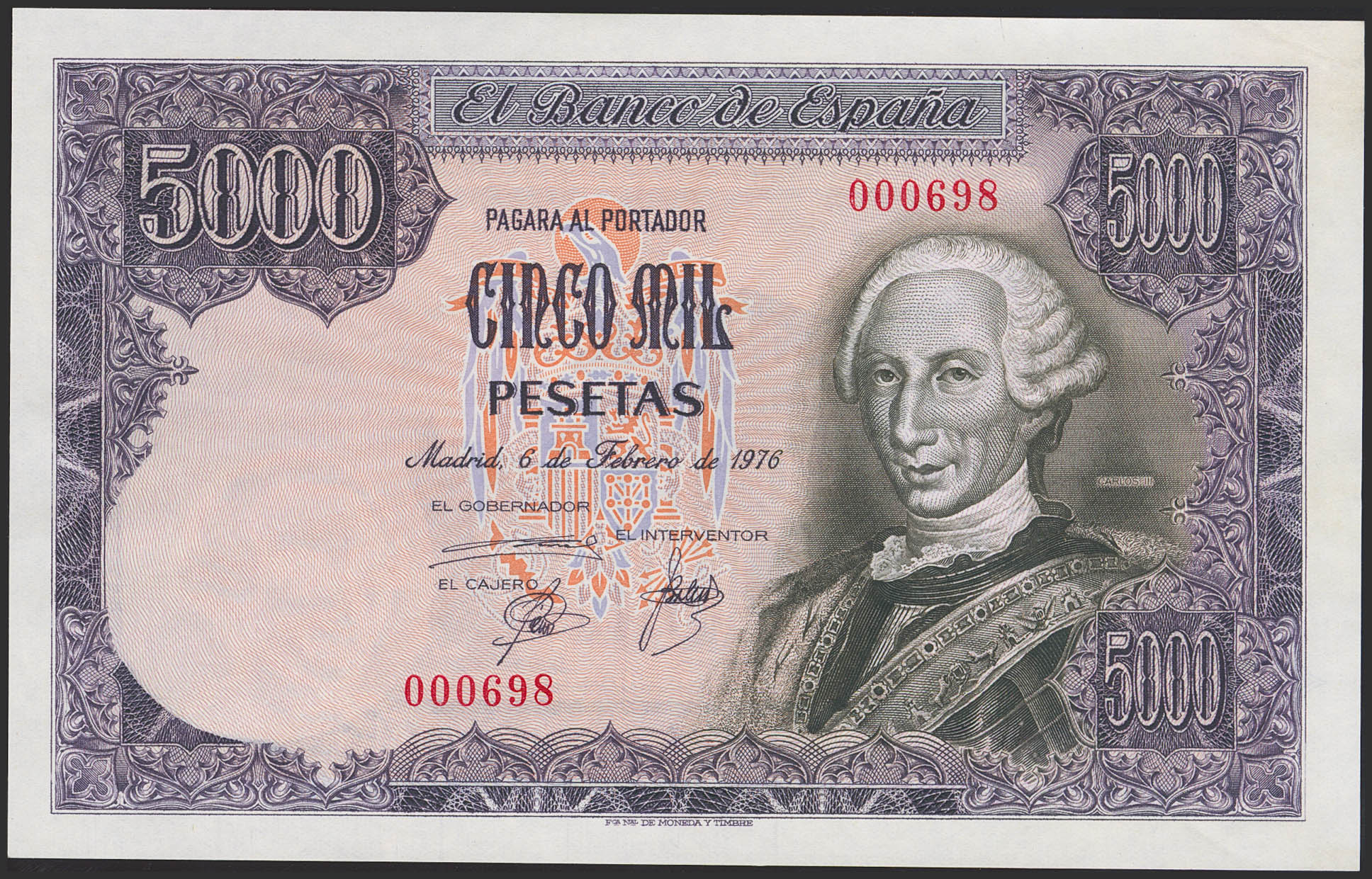 5000 Pesetas. 6 de Febrero de 1976. Sin serie y numeración bajísima (Nº000698). (Edifil 2023: 475, Pick: 155). Raro. SC--.