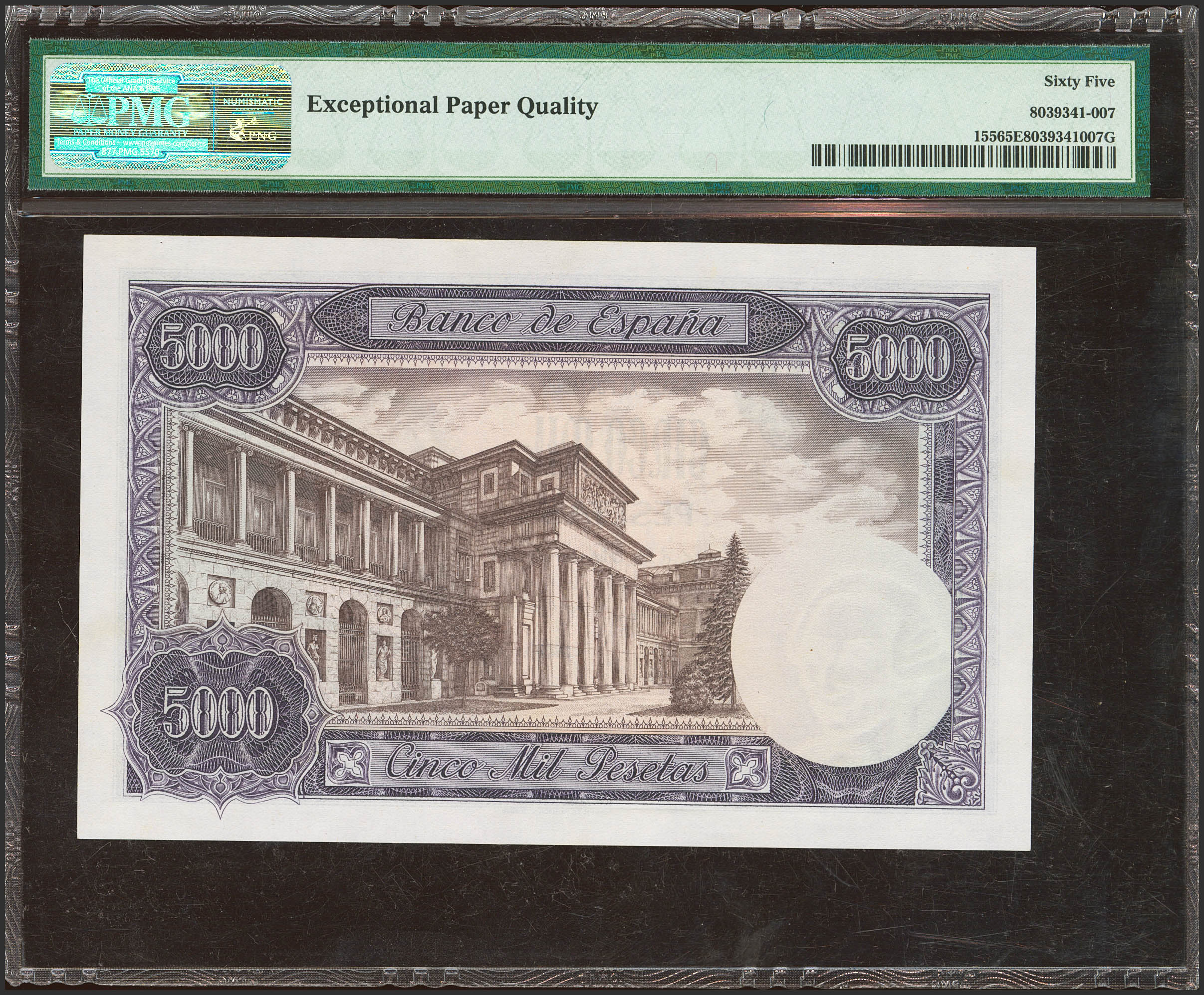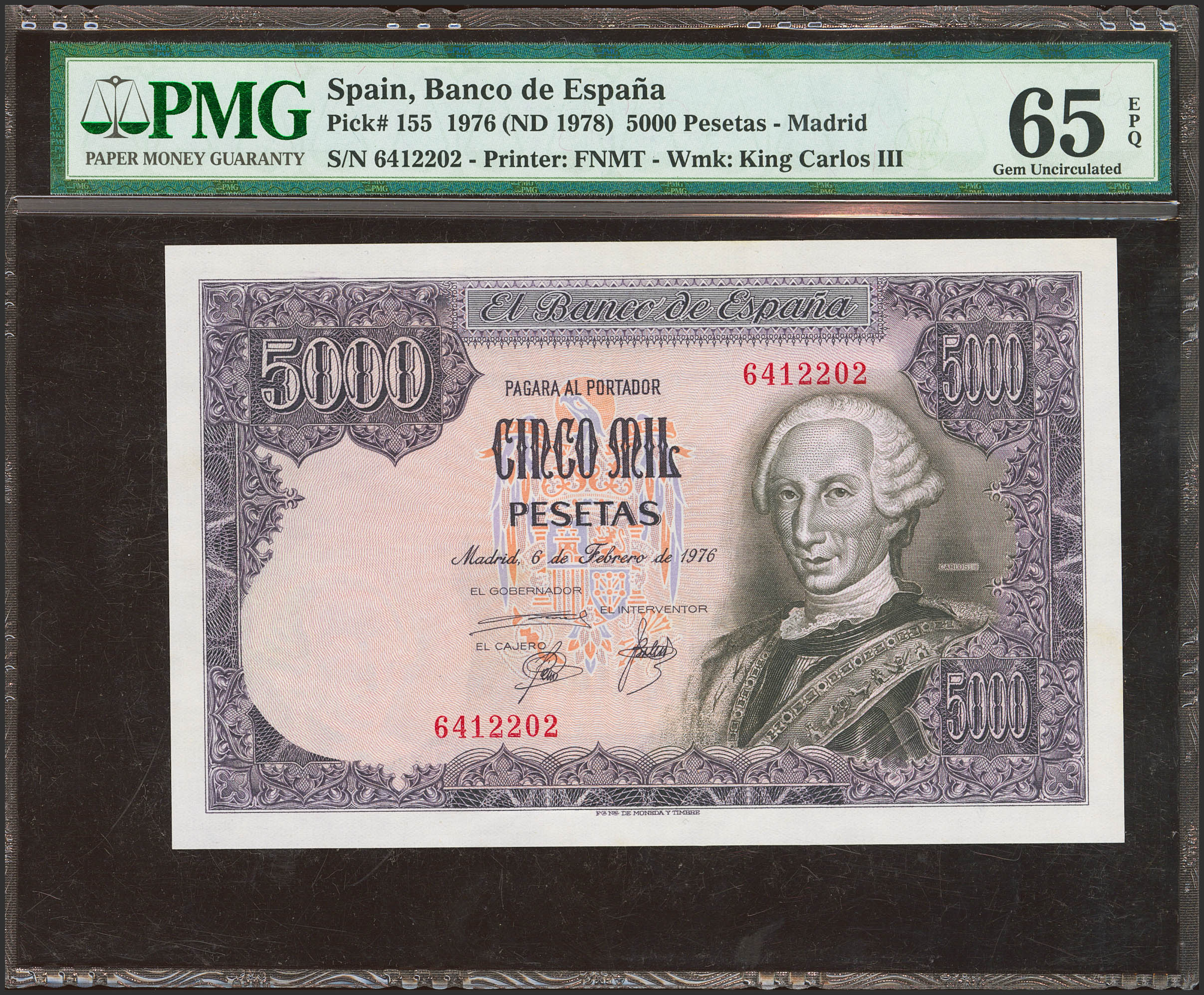 5000 Pesetas. 6 de Febrero de 1976. Sin serie. (Edifil 2023: 475, Pick: 155). Inusual en esta excepcional calidad. SC. Encapsulado PMG65EPQ.