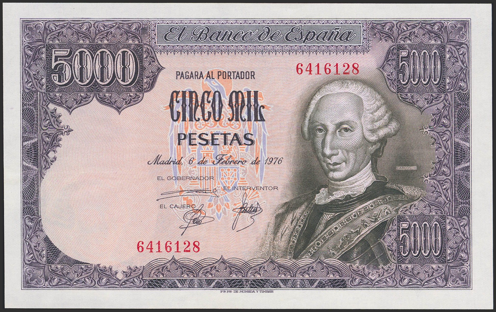 5000 Pesetas. 6 de Febrero de 1976. Sin serie. (Edifil 2023: 475). SC--.