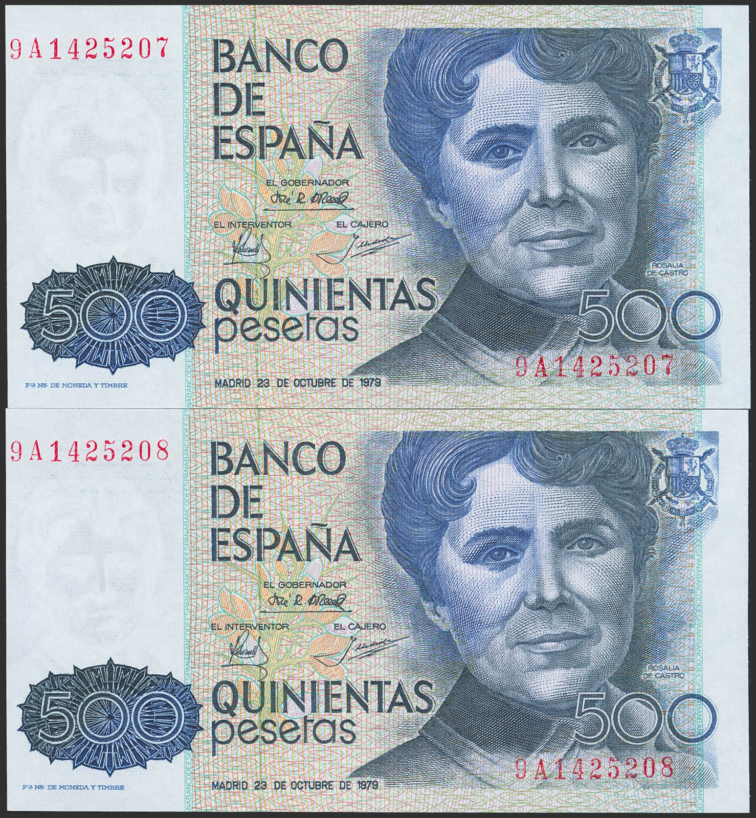 500 Pesetas. 23 de Octubre de 1979. Pareja correlativa. Serie especial 9A. (Edifil 2023: 476b). SC.