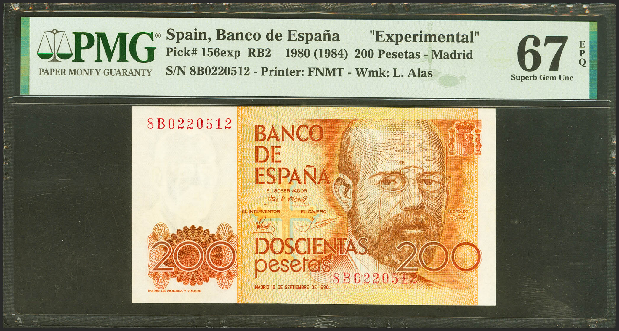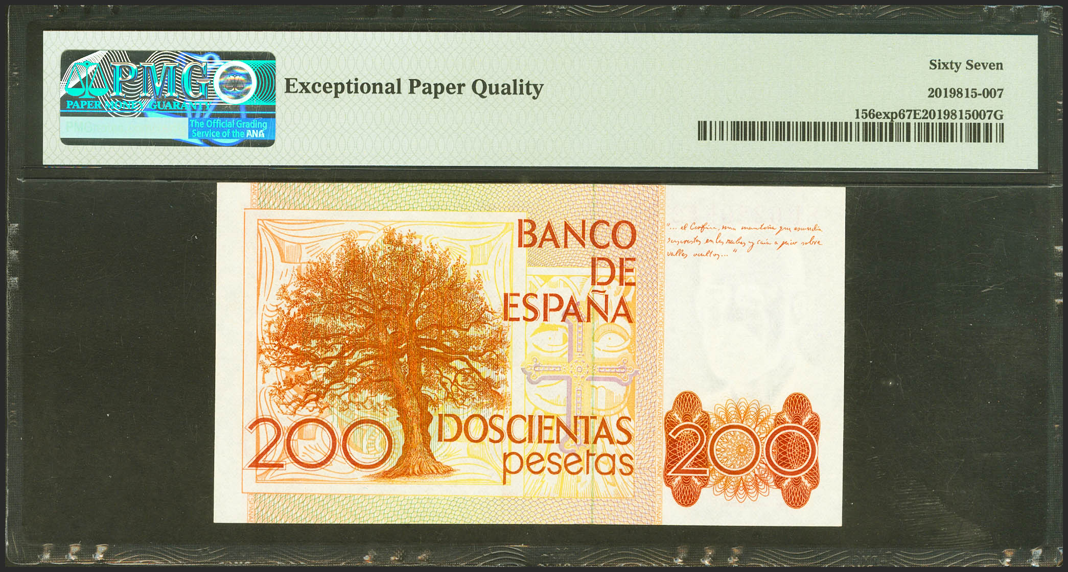 200 Pesetas. 16 de Septiembre de 1980. Serie especial 8B. (Edifil 2021: 480c, Pick: 156exp). Rarísimo en esta excepcional calidad. SC. Encapsulado PMG67EPQ.