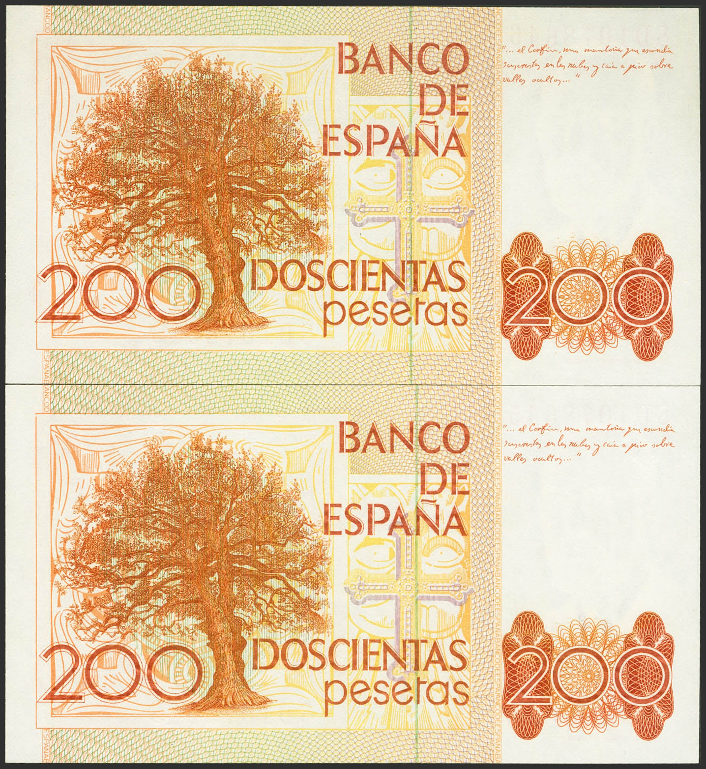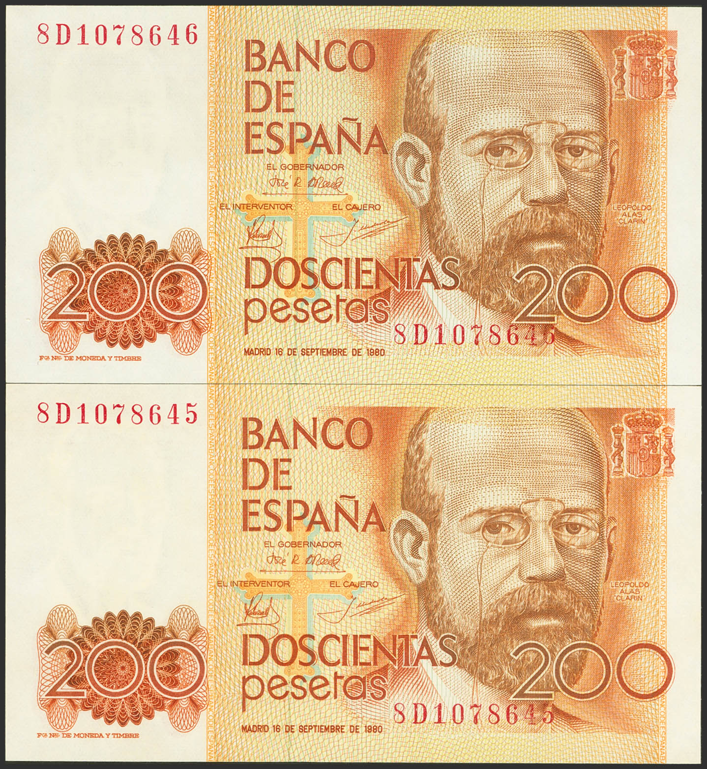 200 Pesetas. 16 de Septiembre de 1980. Pareja correlativa. Serie especial 8D. (Edifil 2023: 480g). Rara. SC.