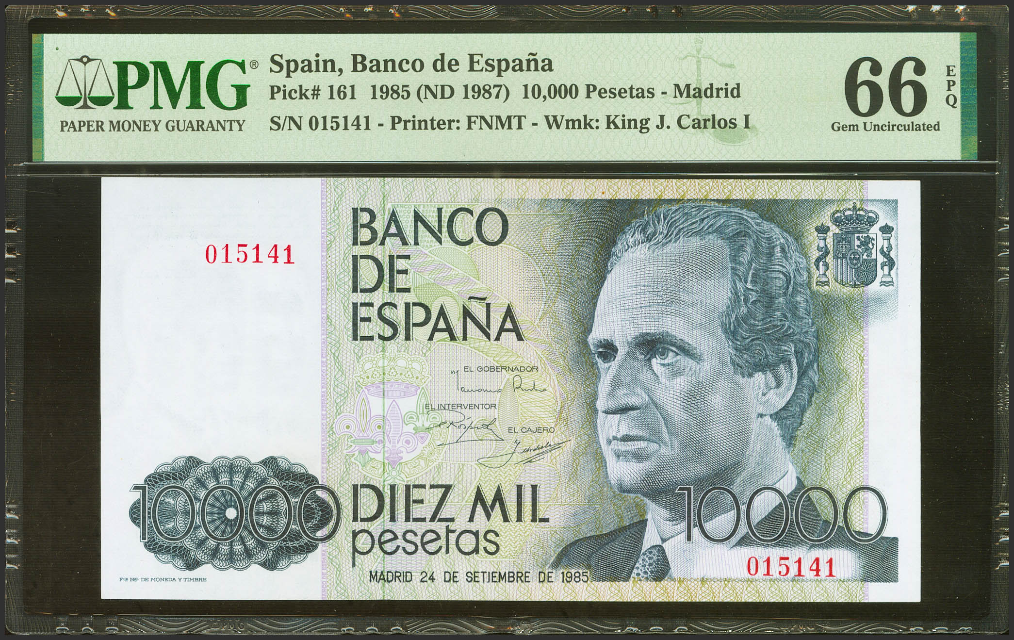 10000 Pesetas. 24 de Septiembre de 1985. Sin serie y baja numeración. (Edifil 2023: 481, Pick: 161). Inusual en esta excepcional calidad. SC. Encapsulado PMG66EPQ.