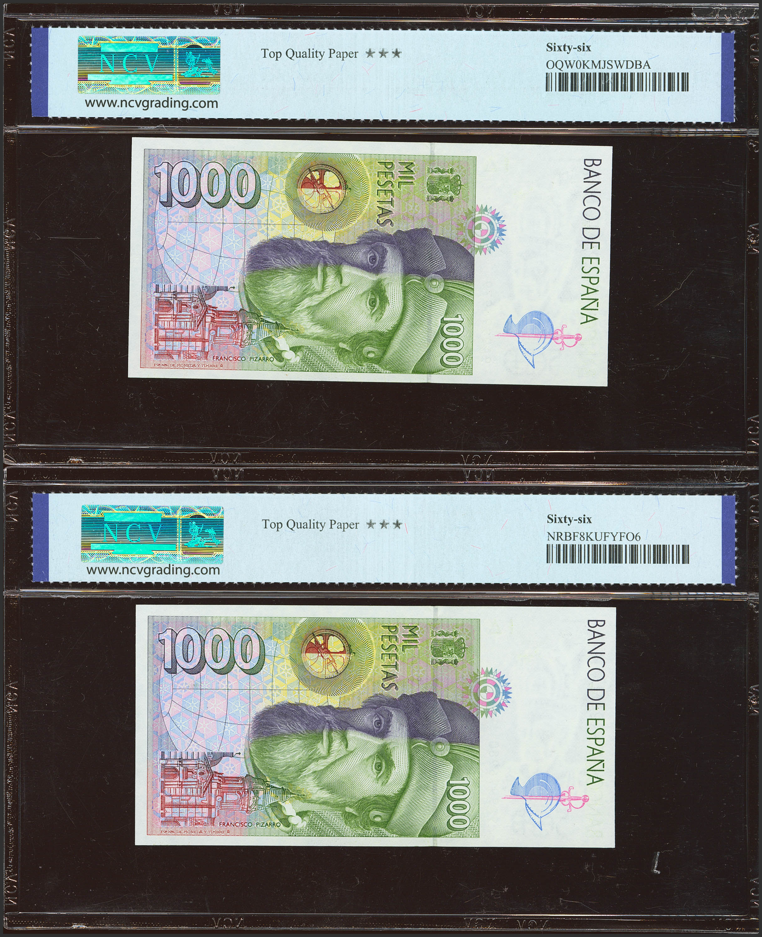 1000 Pesetas. 12 de Octubre de 1992. Pareja correlativa. Serie especial 9A. (Edifil 2023: 483c, Pick: 163*). Raro en esta excepcional calidad. SC. Encapsulados NCV66TQP, ambos.