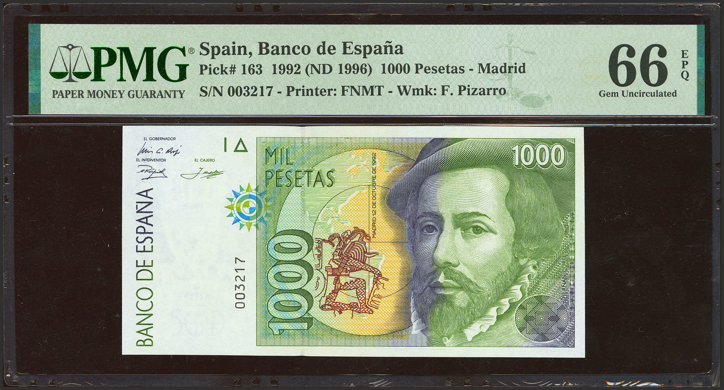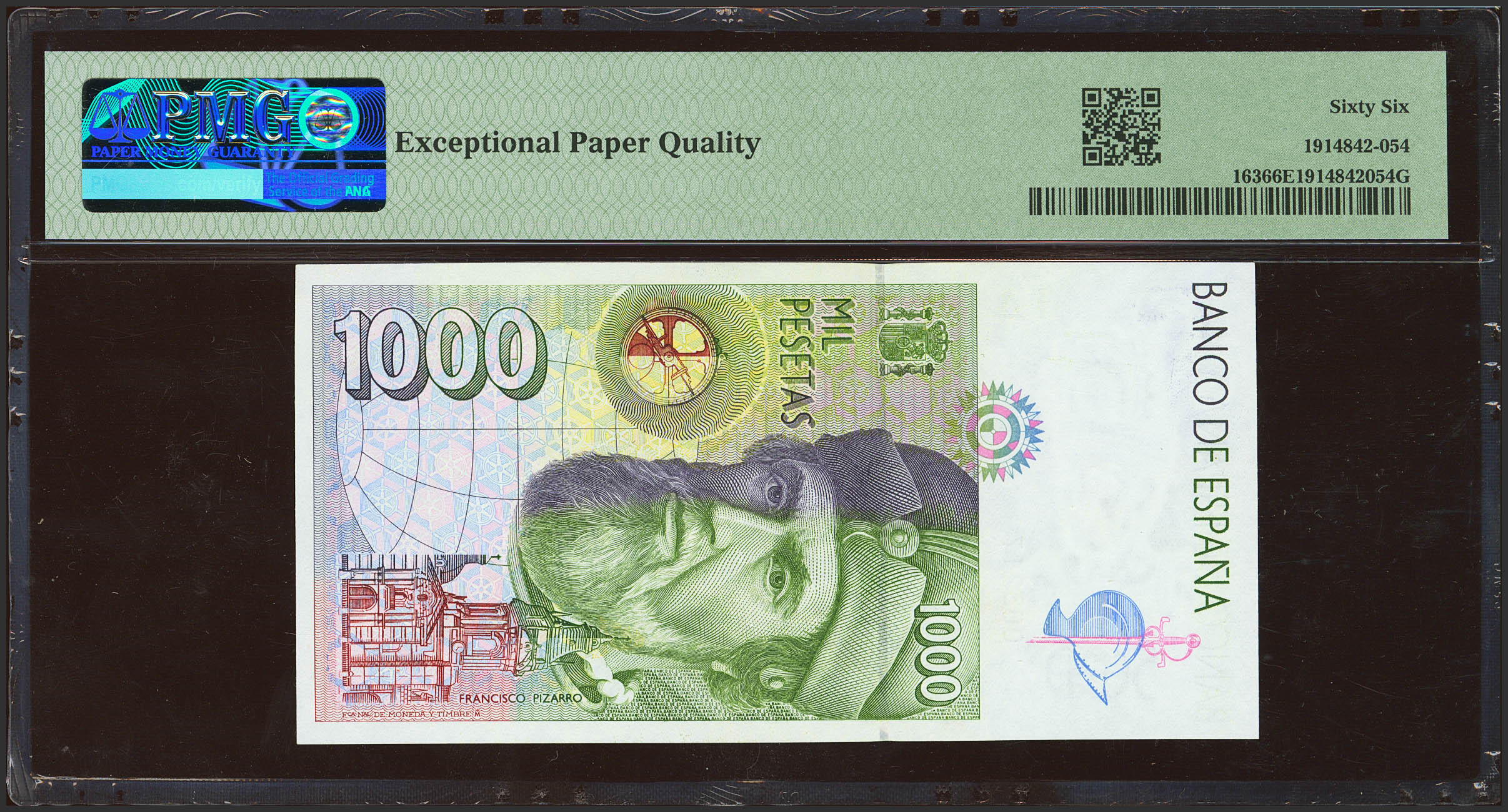 1000 Pesetas. 12 de Octubre de 1992. Sin serie y numeración bajísima. (Edifil 2023: 483, Pick: 163). Apresto original. SC. Encapsulado PMG66EPQ.