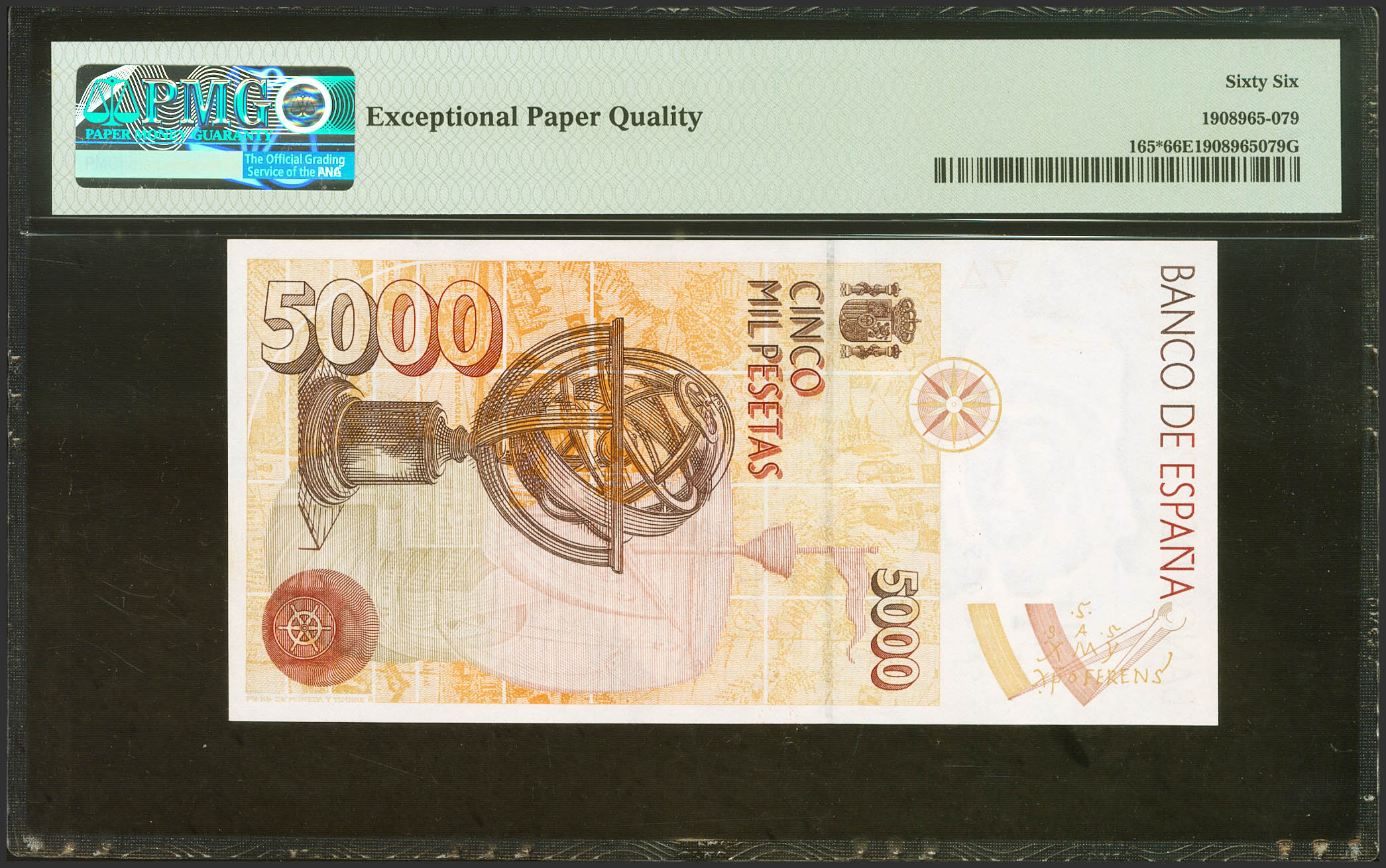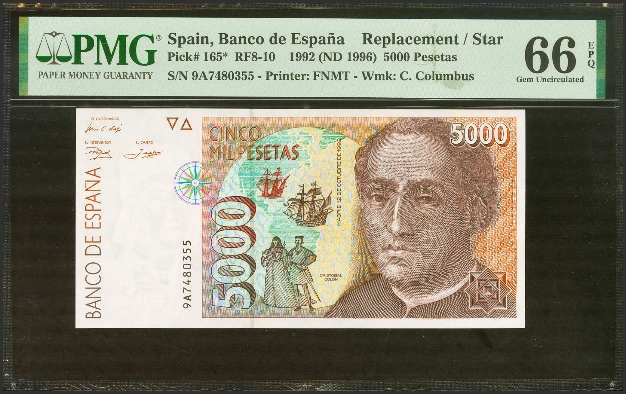5000 Pesetas. 12 de Octubre de 1992. Serie especial 9A. (Edifil 2023: 484b, Pick: 165*). Raro en esta excepcional calidad, apresto original. SC. Encapsulado PMG66EPQ.