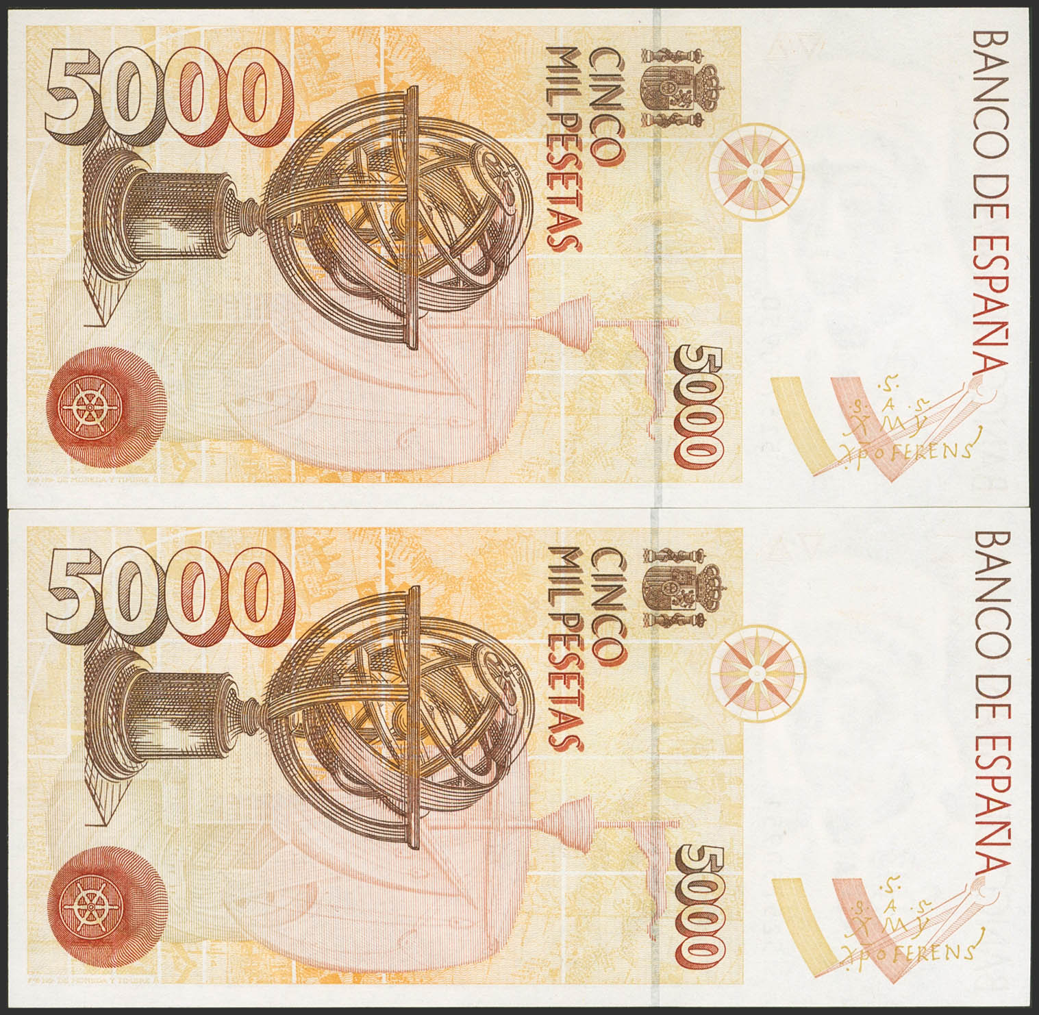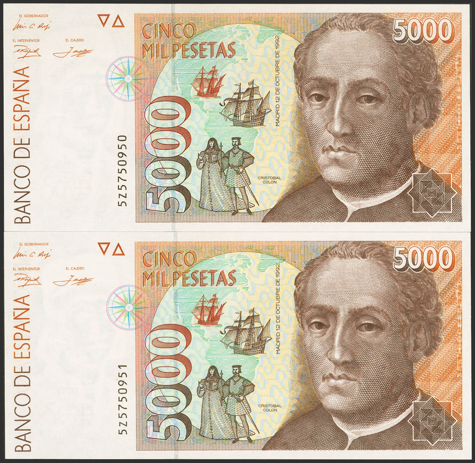 5000 Pesetas. 12 de Octubre de 1992. Pareja correlativa. Serie 5Z. (Edifil 2023: 484a). SC.