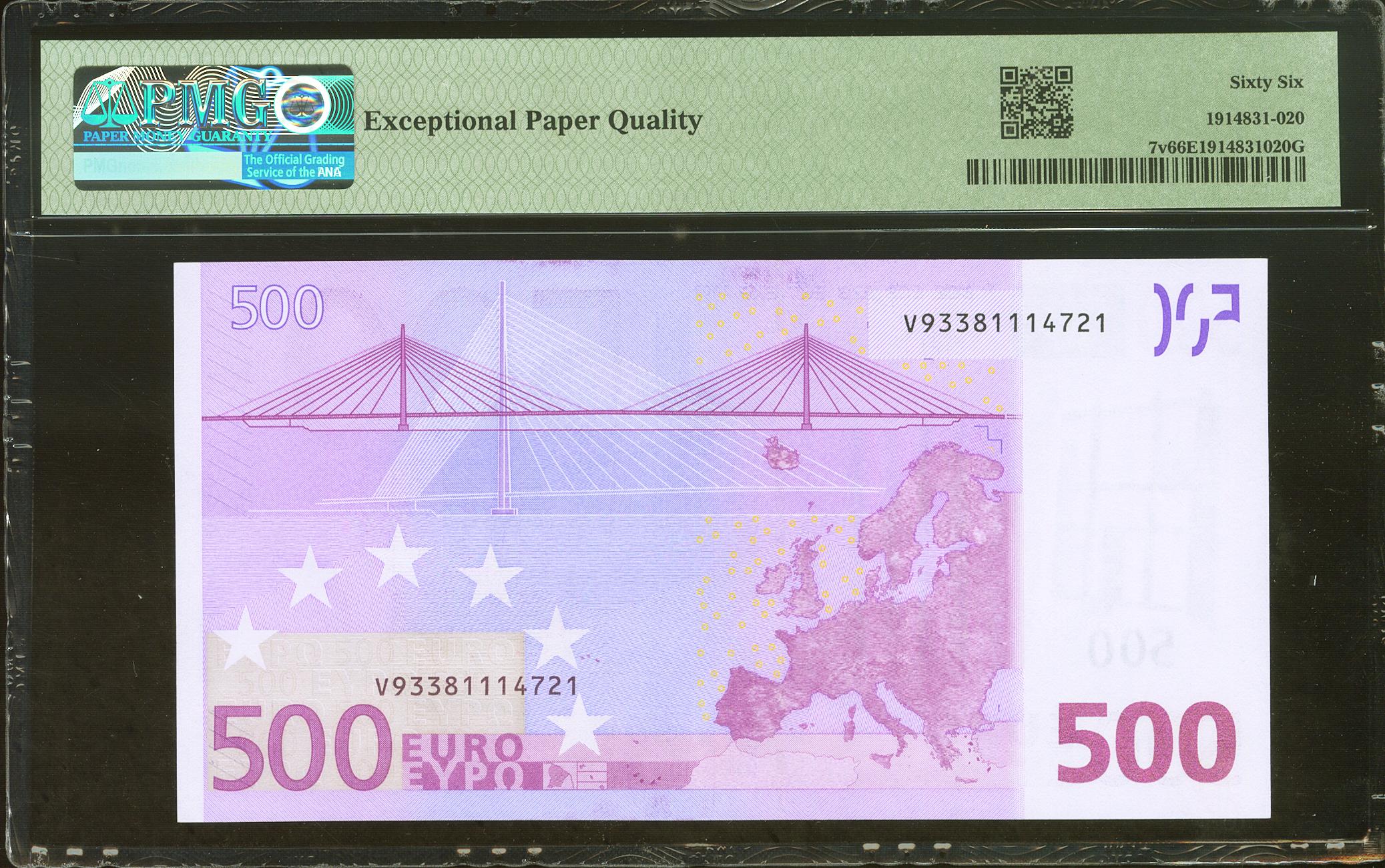 500 Euros. 1 de Enero de 2002. Firma Duisenberg. Serie V (España). (Edifil 2021: 492). Inusual. SC. Encapsulado PMG66EPQ.