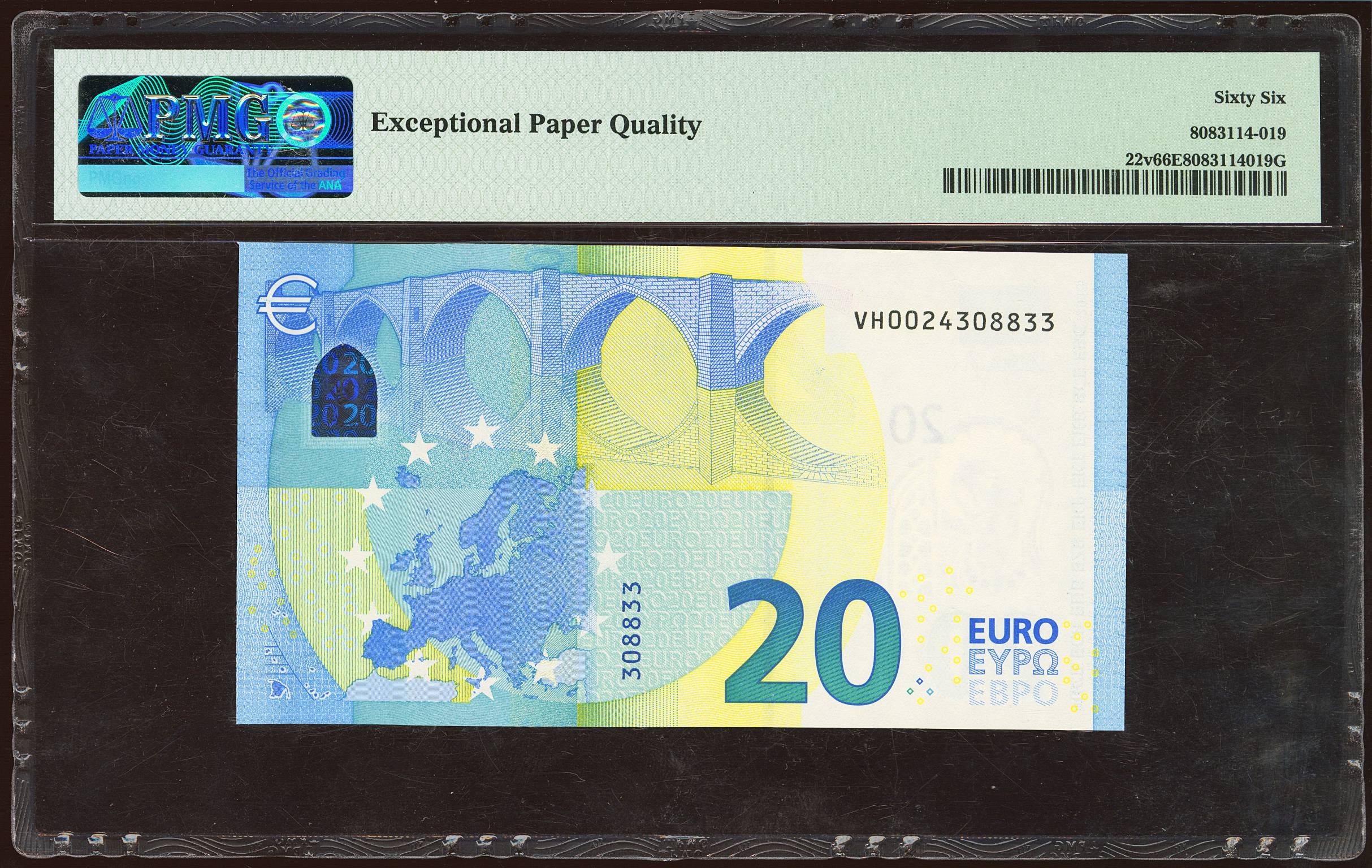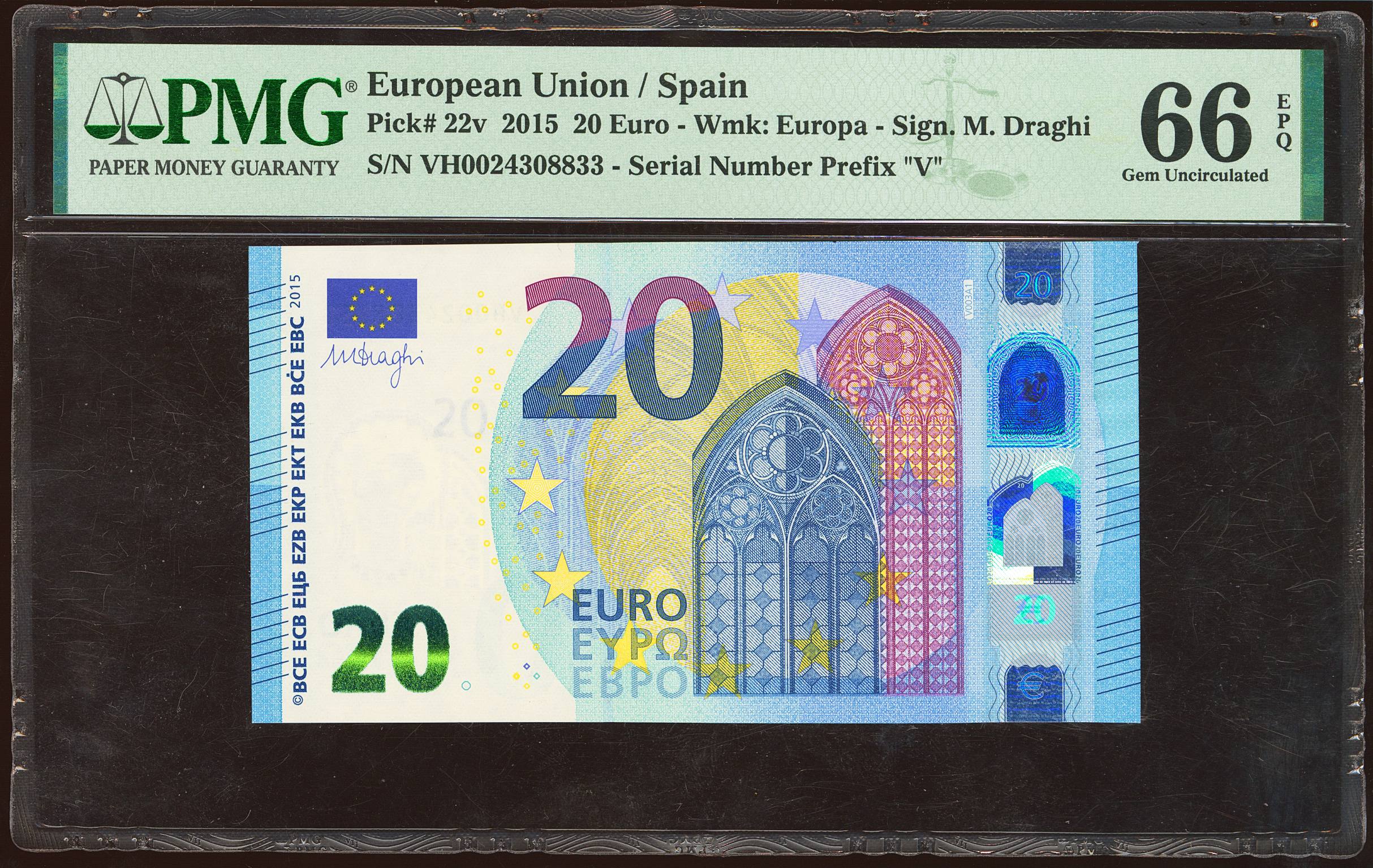 20 Euros. 25 de Noviembre de 2015. Firma Draghi. Serie especial VH (España). (Edifil 2023: 495a, Pick: 22v). SC. Encapsulado PMG66EPQ.