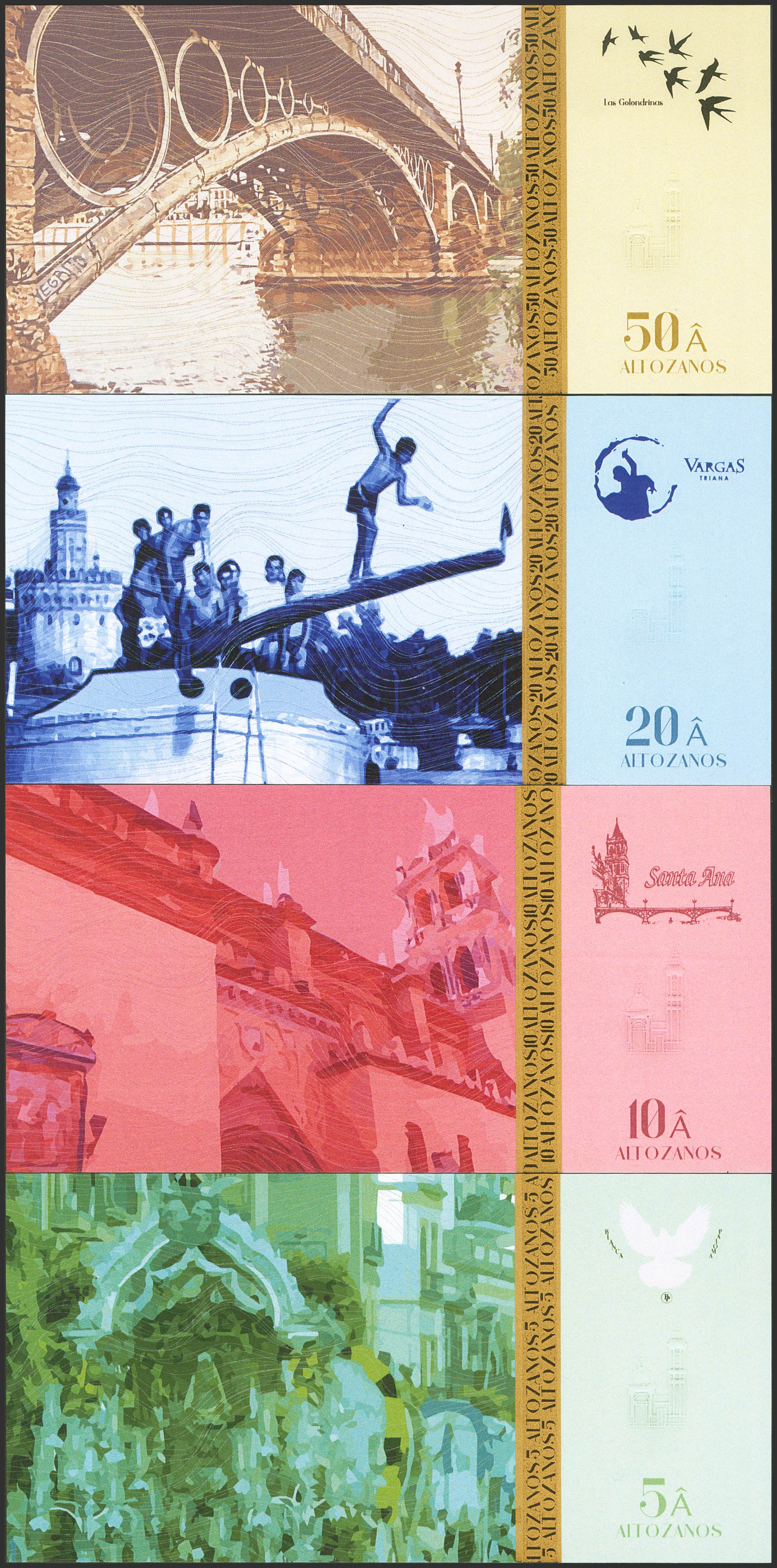 Serie de 4 billetes de fantasía con una moneda "turística" de 5 Altozanos, 10 Altozanos, 20 Altozanos y 50 Altozanos. 2021. Altozanos de Triana, Sevilla. Diseño de Brandemia. SC.PD: Finalista de los Premios Agripina 2021 y elegida como idea más original. El nombre "Altozano" proviene de la plaza de entrada al barrio desde el Casco Histórico hispalense. Su símbolo propio (una A con acento circunflejo) representa el hogar que es Triana para los suyos. La marca de agua es la Capilla del Carmen, paradigmática dentro del barrio y una de las obras que quedan en Sevilla del gran arquitecto Aníbal González, arquitecto de la Exposición Iberoamericana de 1929 y creador, entre otros, de la Plaza de España o de la Plaza de América.