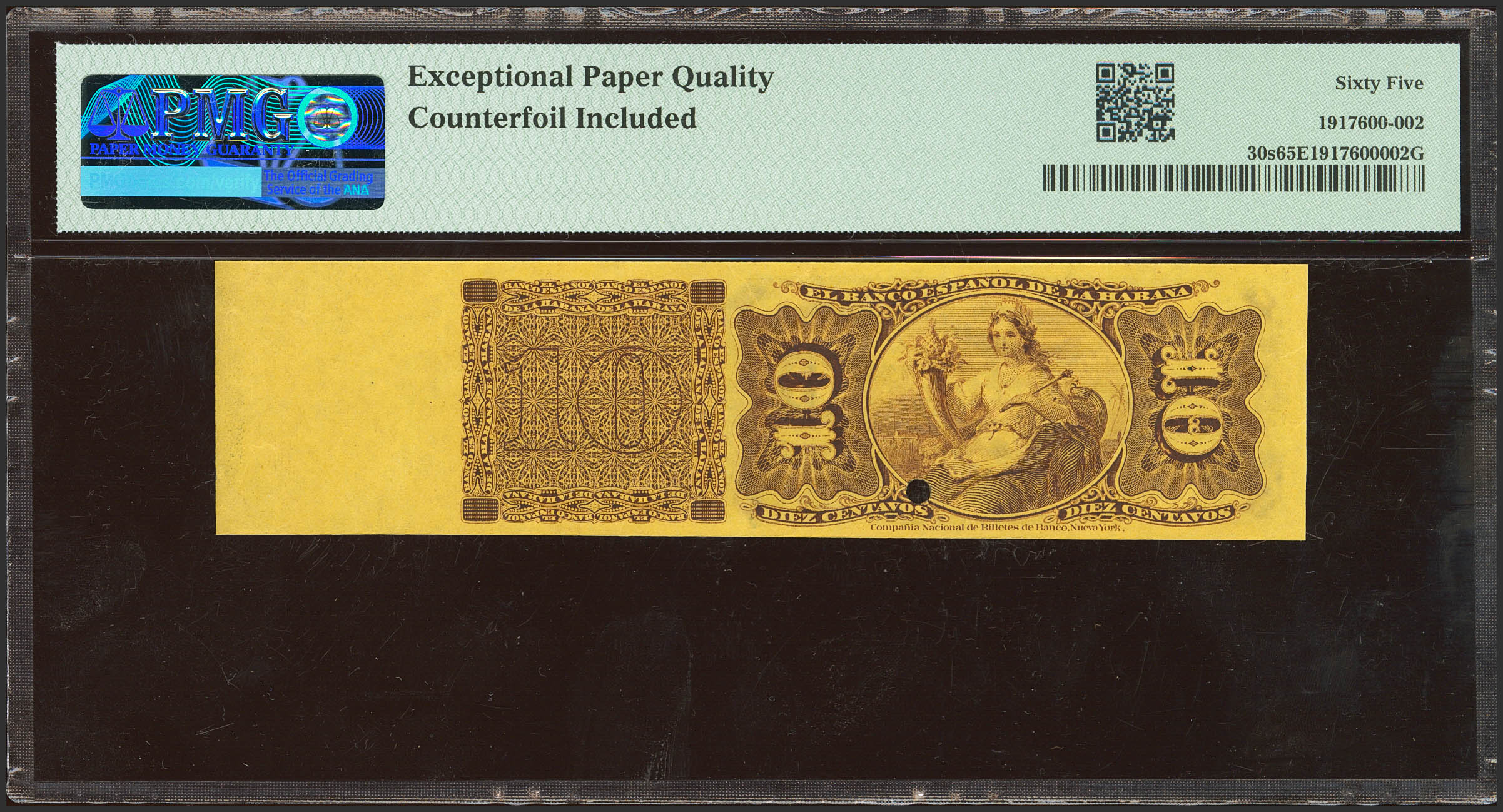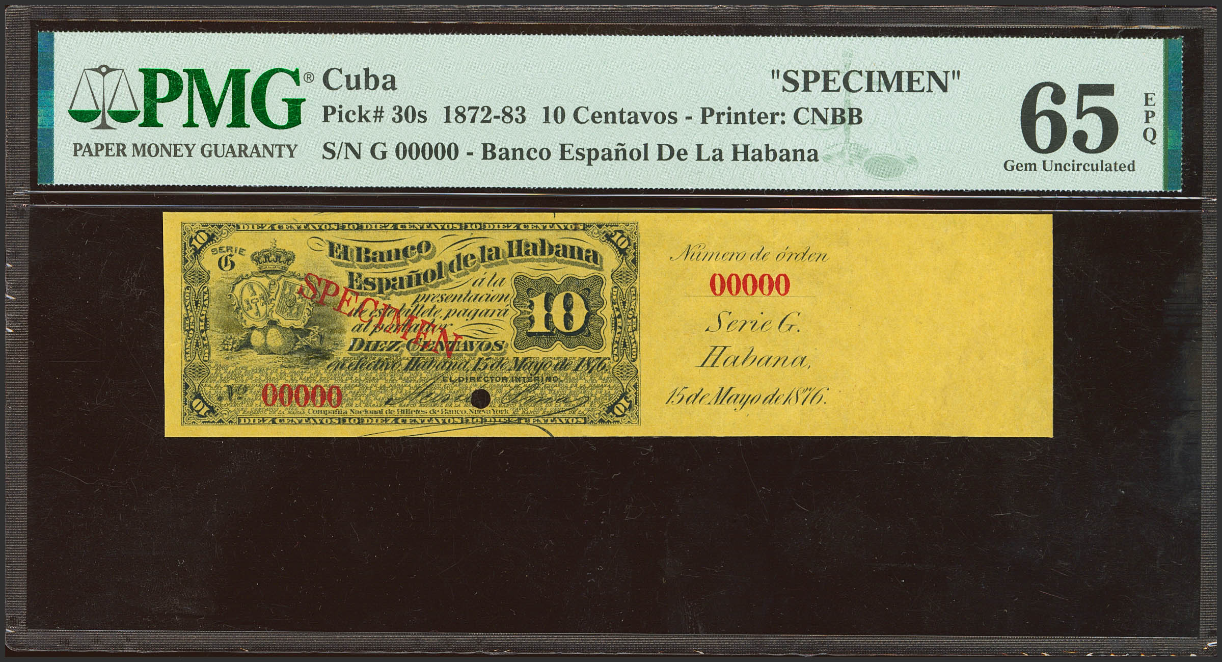 BANCO ESPAÑOL DE LA ISLA DE CUBA. 10 Centavos. 15 de Mayo de 1876. Serie G, Specimen, numeración 00000 y con matriz a la izquierda. (Edifil 2023: 45, Pick: 30s). Rarísimo, especialmente en esta excepcional calidad. SC. Encapsulado PMG65EPQ.