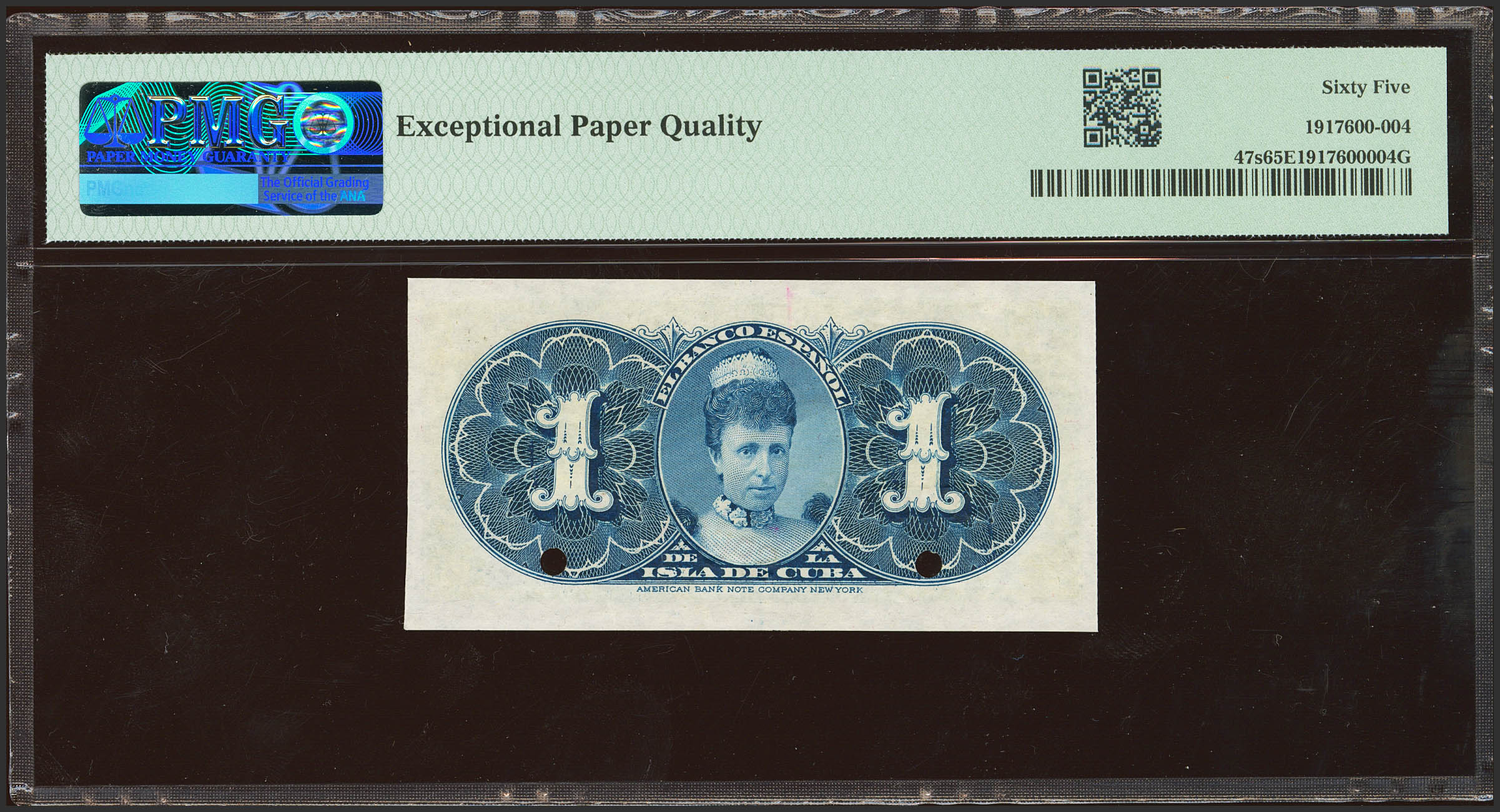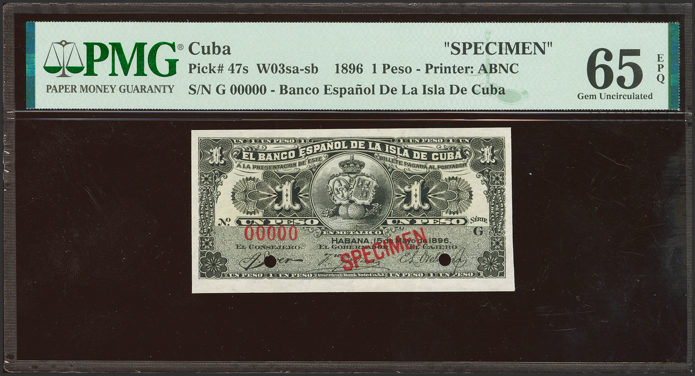 BANCO ESPAÑOL DE LA ISLA DE CUBA. 1 Peso. 15 de Mayo de 1896. Serie G, Specimen y numeración 00000. (Edifil 2023: 71, Pick: 47s). Rarísimo, especialmente en esta excepcional calidad. SC. Encapsulado PMG65EPQ.