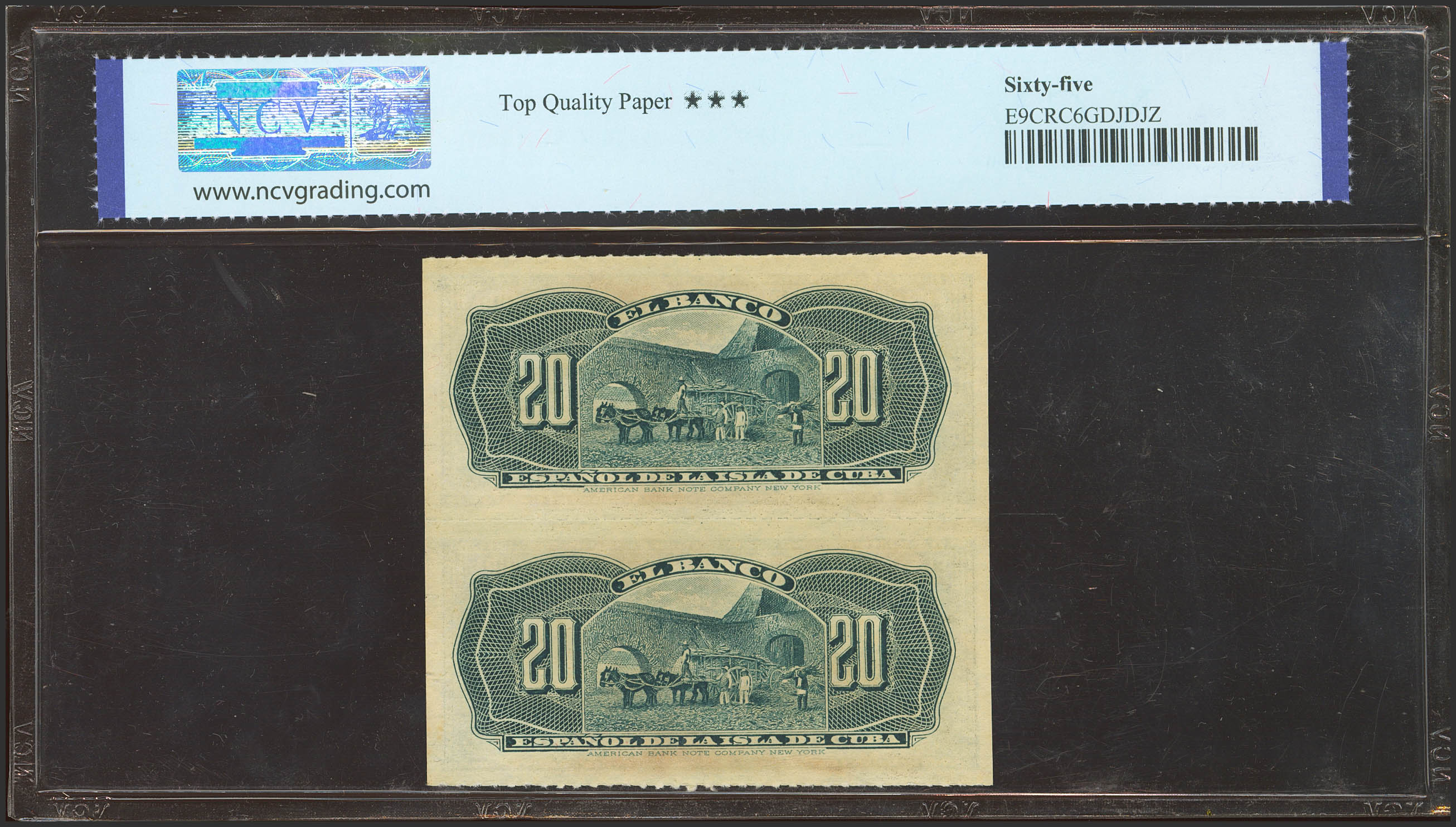 BANCO ESPAÑOL DE LA ISLA DE CUBA. Conjunto de 2 billetes correlativos de 20 Centavos (sin desprender), emitidos el 15 de Febrero de 1897 (Edifil 2023: 85, Pick: 53a). Apresto original. SC. Encapsulado NCV65TQP.