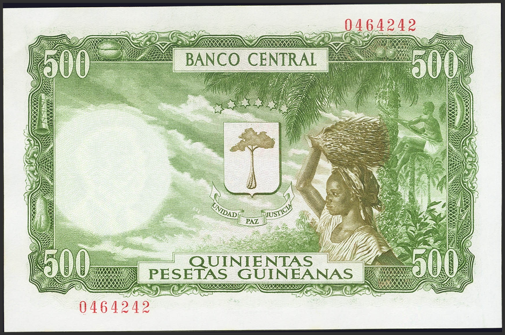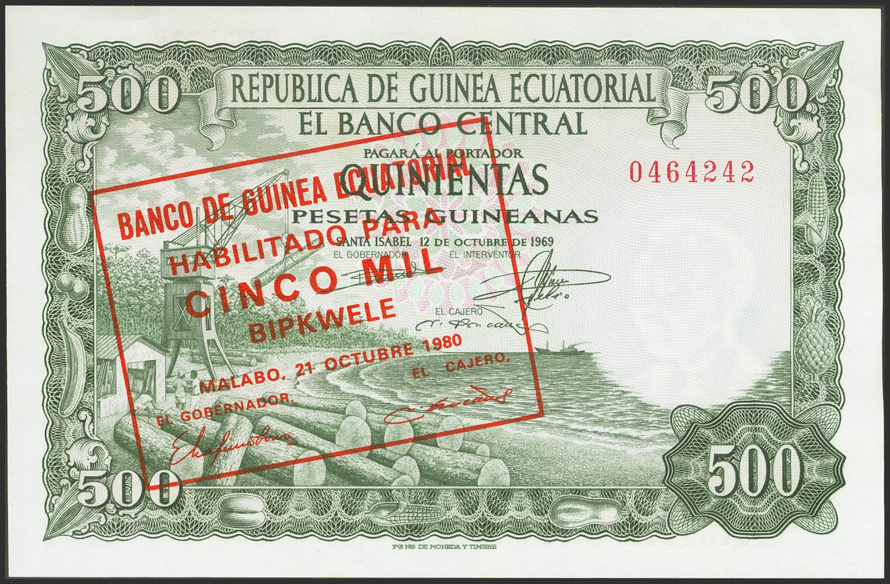 GUINEA ECUATORIAL. 5000 Bipkele sobre 500 Pesetas Guineanas. 19 de Diciembre de 1980. Sin serie y sobrecarga en el anverso en rojo. (Pick: 19). Manchitas del tiempo. SC.
