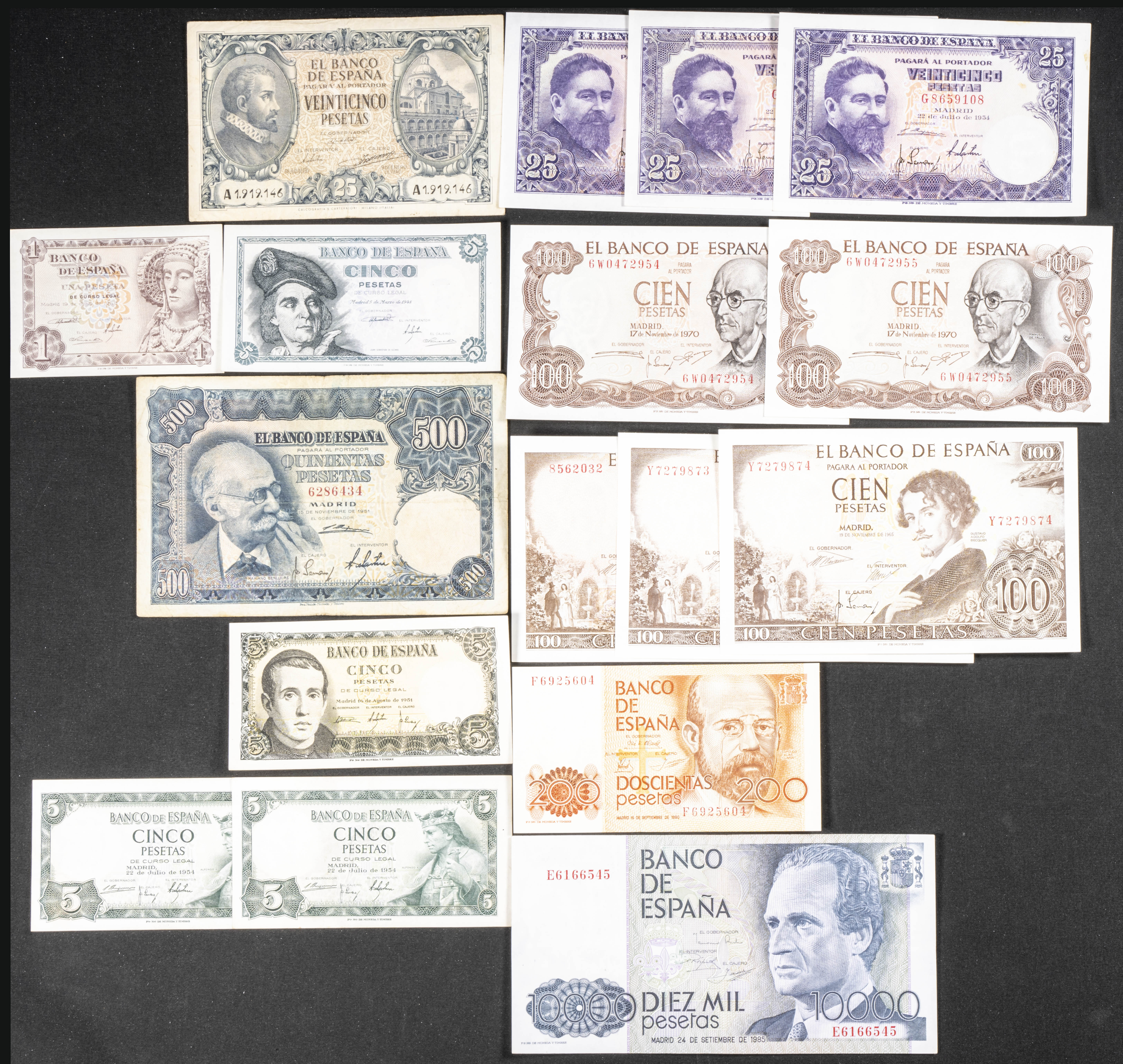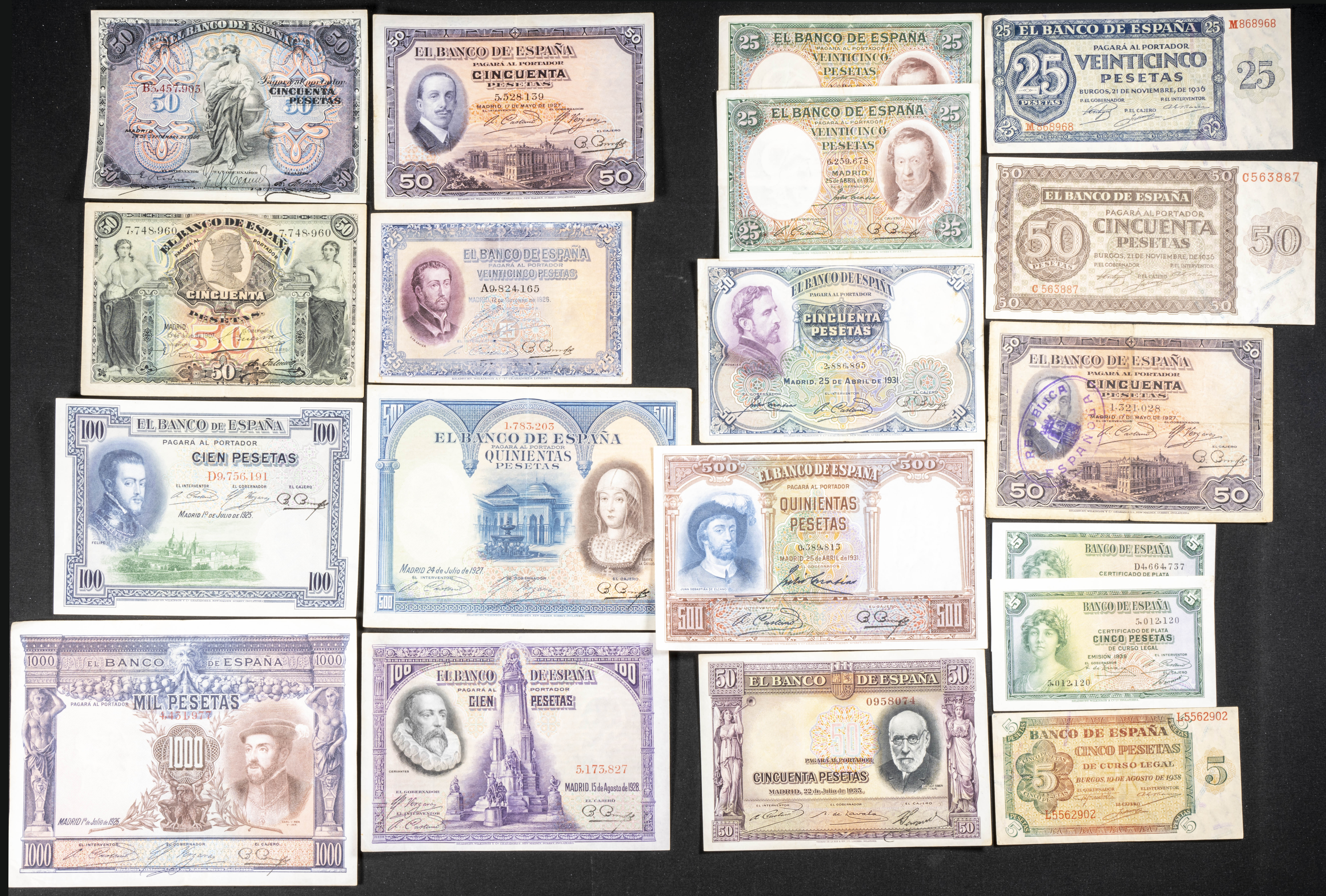 Conjunto de más de 35 billetes del Banco de España, de diferentes emisiones y en diversas calidades. A EXAMINAR.