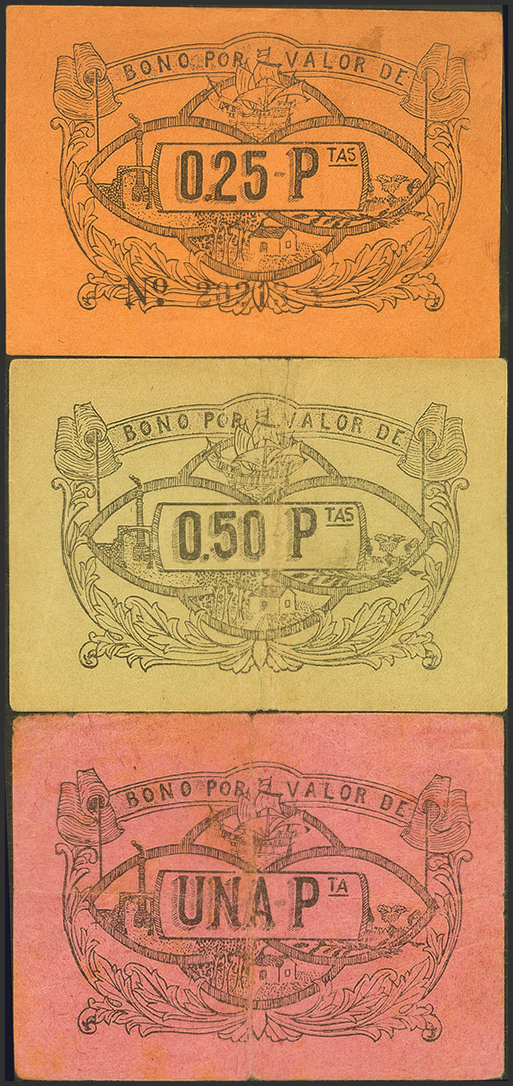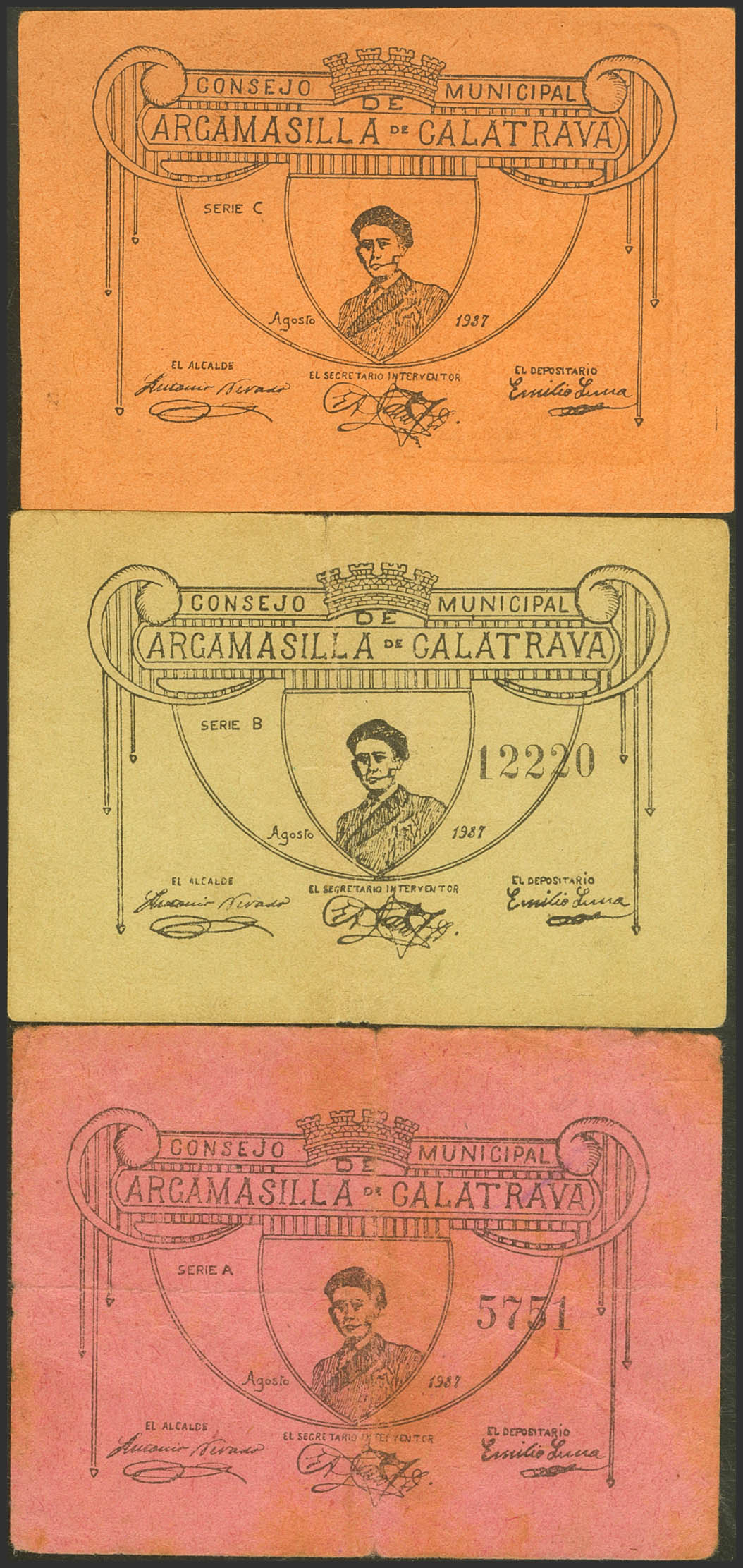 ARGAMASILLA DE CALATRAVA (CIUDAD REAL). 25 Céntimos, 50 Céntimos y 1 Peseta. Agosto 1937. Serie C, B y A, respectivamente. (González: 769/71). Inusual serie completa. MBC+.
