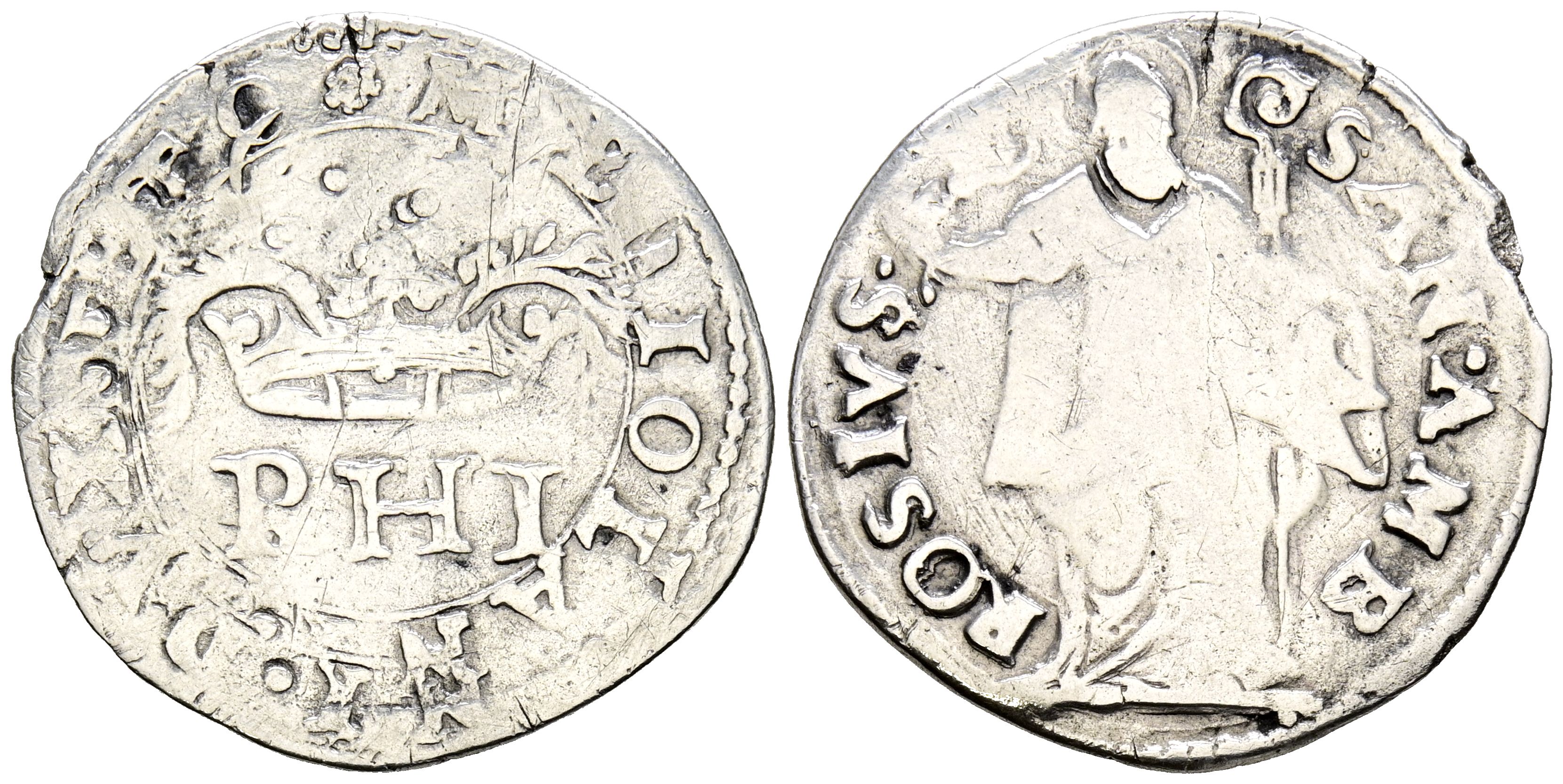 FELIPE II (1556-1598). 5 Sueldos. (Ar. 1,81g/23mm). S/D. Milán. (Vicenti 15). BC. Muy rara.