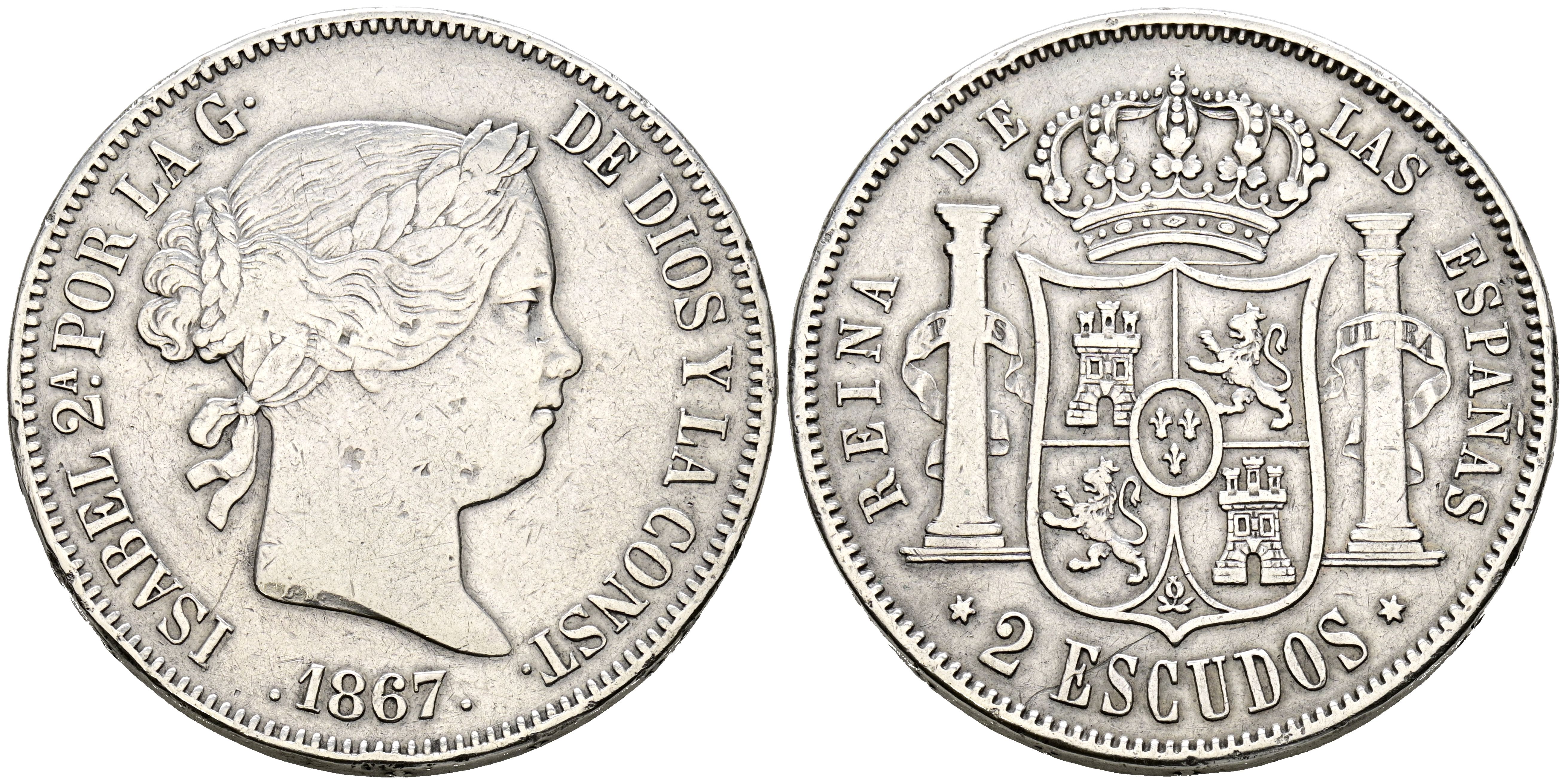 ISABEL II (1833-1868). 2 Escudos. (Ar. 25,86g/37mm). 1867. Madrid. (Cal-2019-647). MBC.