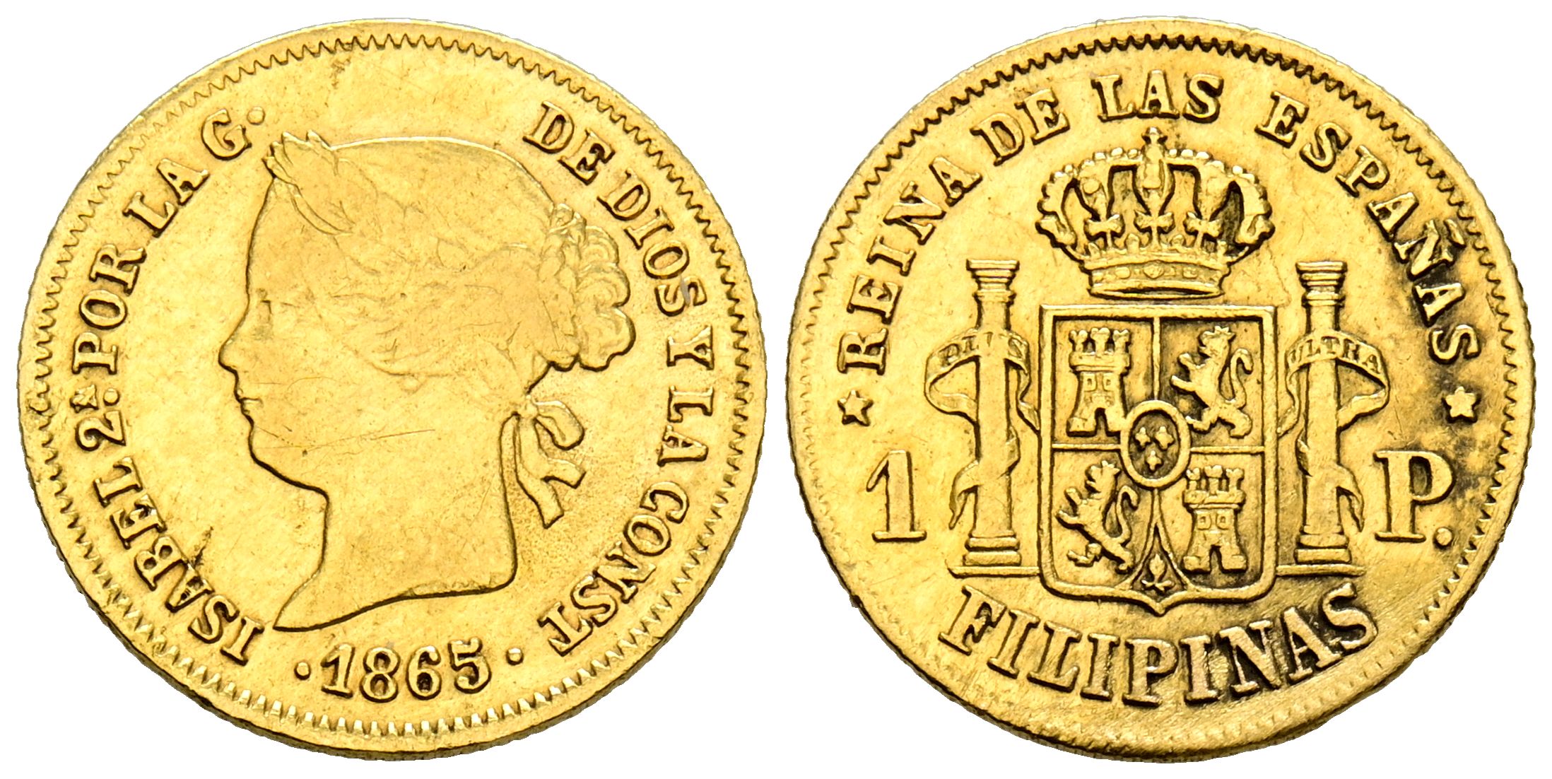 ISABEL II (1833-1868). 1 Peso. (Au. 1,68g/15mm). 1865. Manila. (Cal-2019-829). MBC. Escaso.