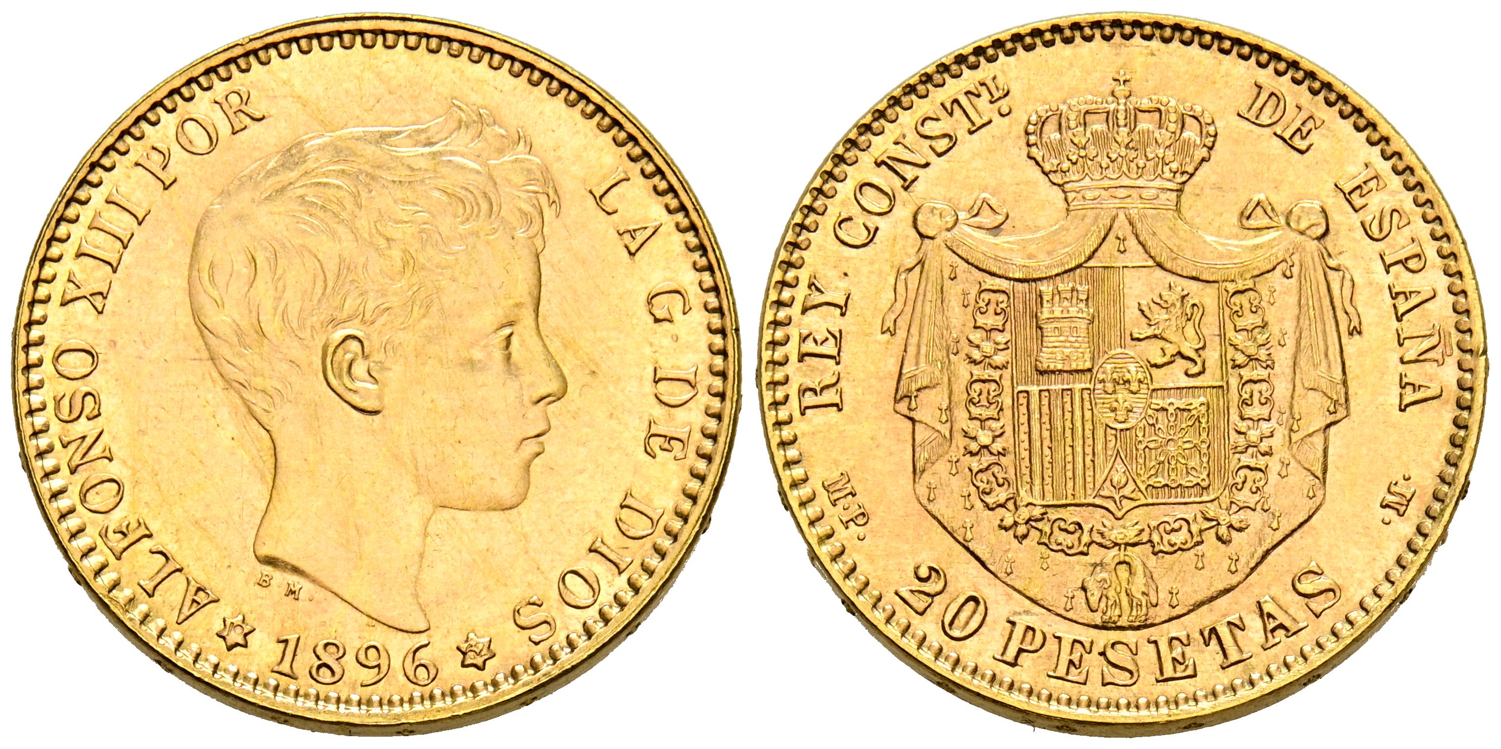 ALFONSO XIII (1885-1931). 20 Pesetas. (Au. 6,45g/21mm). 1896 *19-62. Madrid MPM. (Cal-2019-173-Estado Español). Reacuñación oficial. EBC+.
