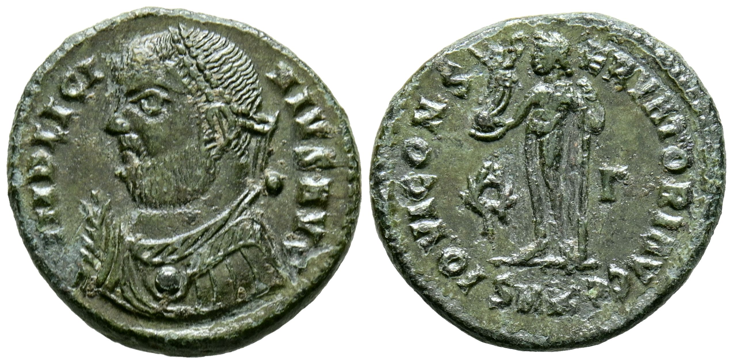 LICINIO I. Follis. (Ae. 2,93g/17mm). 317-320 d.C. Cícico. (RIC 9). Anv: Busto laureado y con coraza a izquierda de Licinio I portando mappa, globo y cetro, alrededor leyenda: IMP LICINIVS AVG. Rev: Júpiter estante a izquierda portando Victoria con corona de laurel y cetro, en campor corona de laurel, detrás: Γ, alrededor leyenda: IOVI CONSERVATORI AVGG. MBC+. Pátina verde.