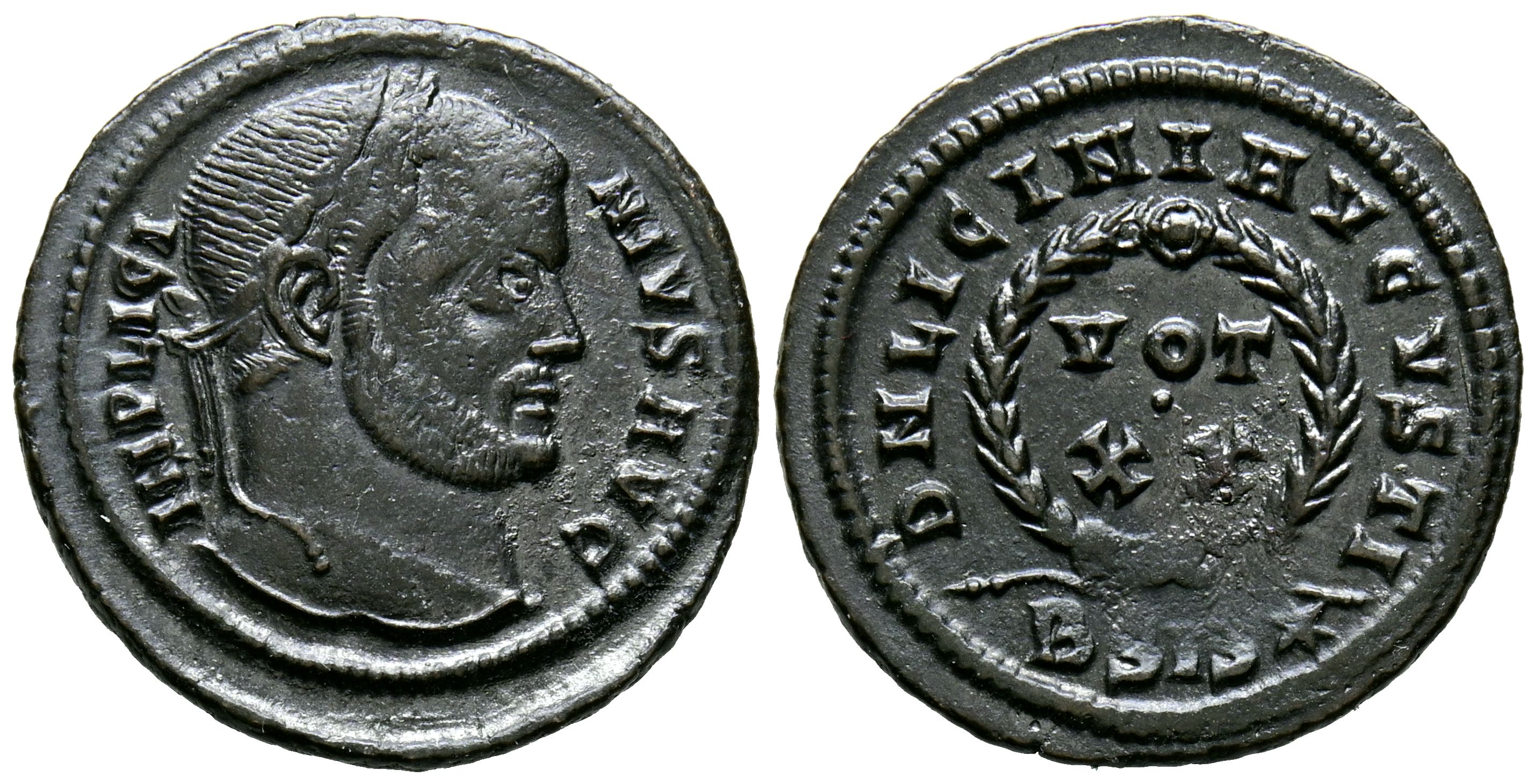 LICINIO I. Follis. (Ae. 2,68g/20mm). 320-321 d.C. Siscia. (RIC 160). Anv: Cabeza laureada de Licinio I a derecha, alrededor leyenda: IMP LICINIVS AVG. Rev: Leyenda: VOT/XX, dentro de corona de laurel, debajo: BSIS estrella, alrededor leyenda: DN LICINI AVGVSTI. EBC-/EBC. Vano en reverso.