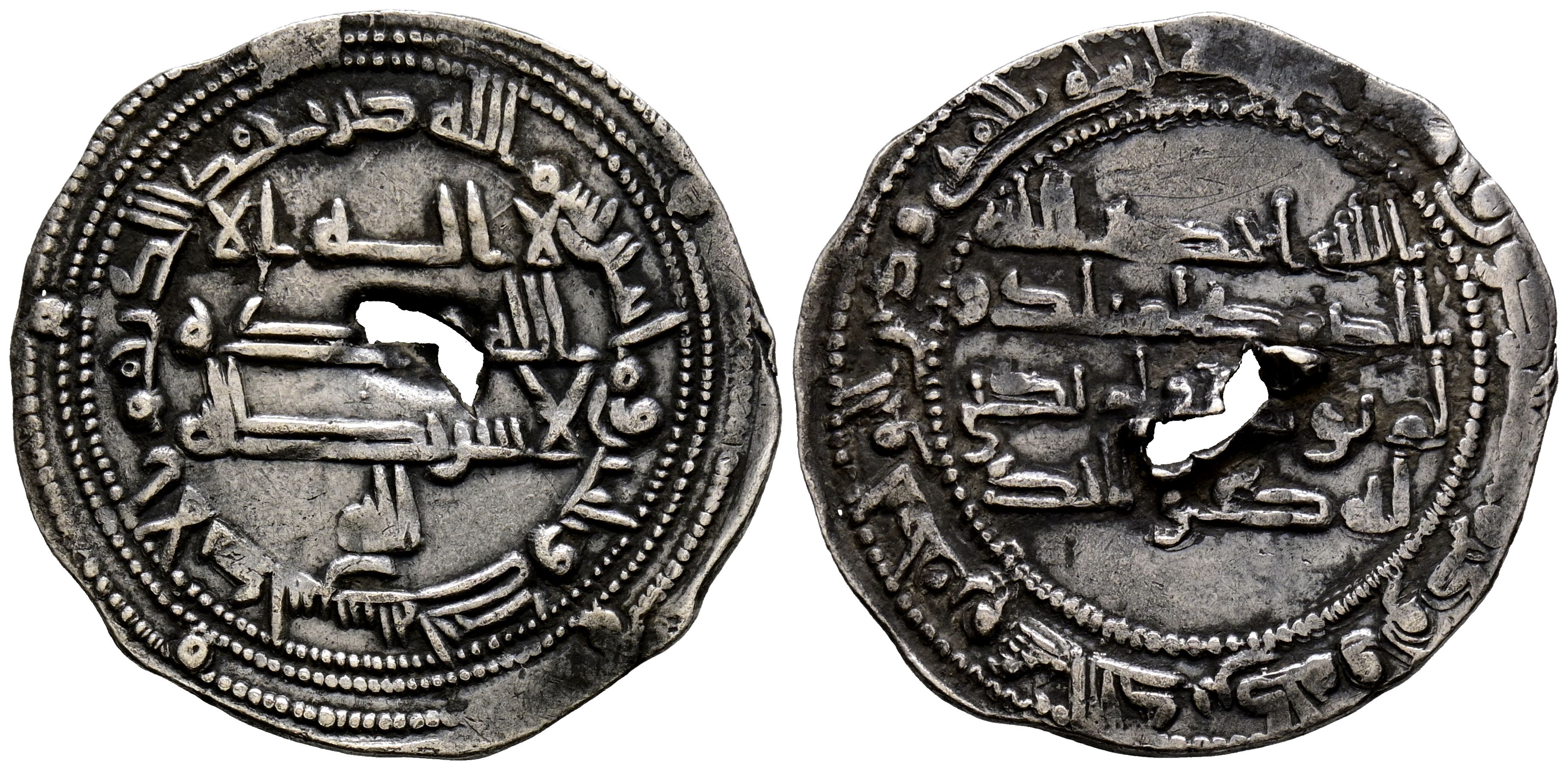 EMIRATO DEPENDIENTE DE CÓRDOBA. Muhammad I. Dirham. (Ar. 2,67g/26mm). 231H. al-Ándalus / الاندلس. (Vives 198; Frochoso 231.1). MBC. Perforación.