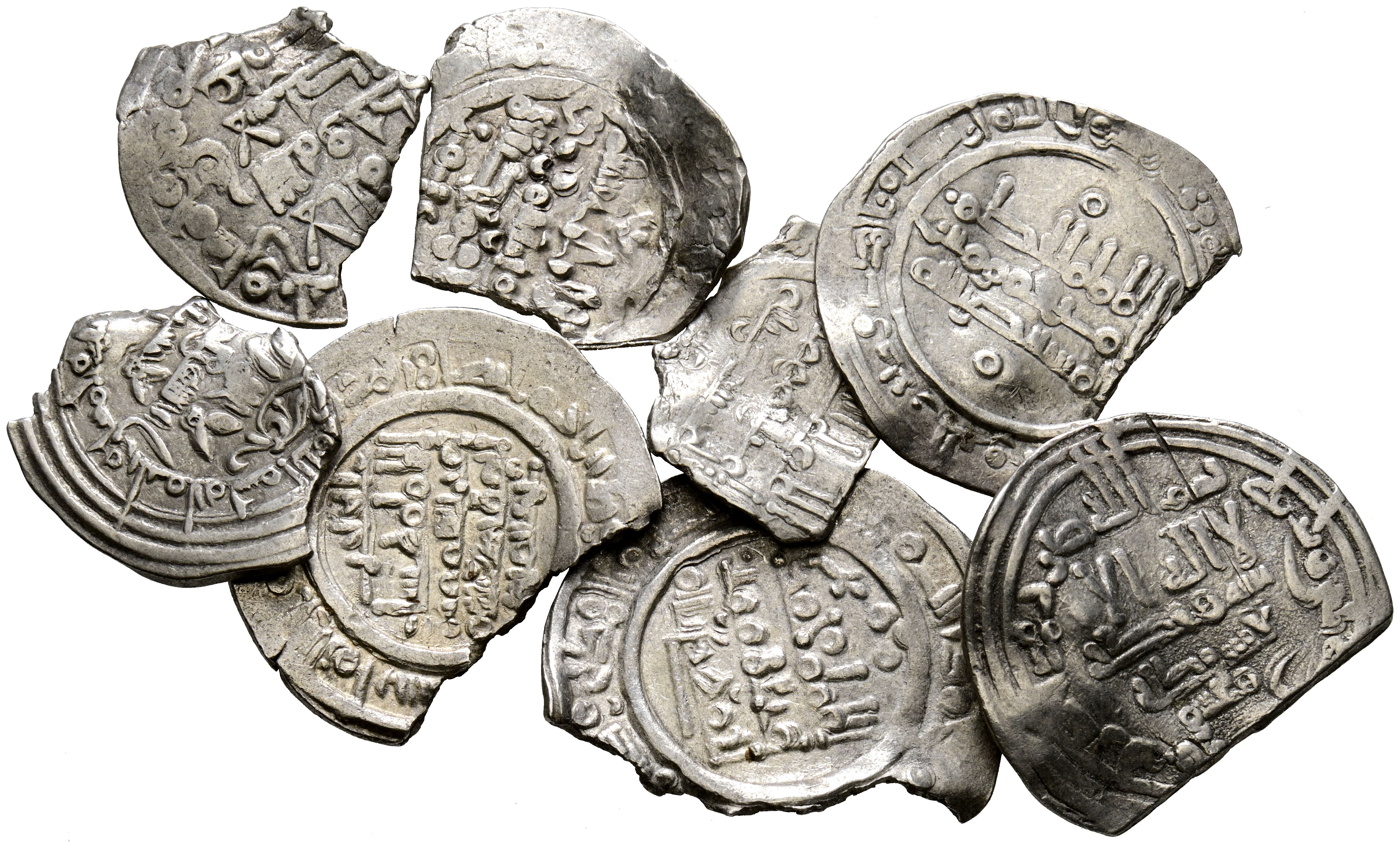HISPANO ARABE. Interesante conjunto formado por 8 fragmentos de dirham Califales acuñados entre los reinos de Abd al-Rahman III y Muhammad II. Diferentes años, medidas y cecas. A EXAMINAR.