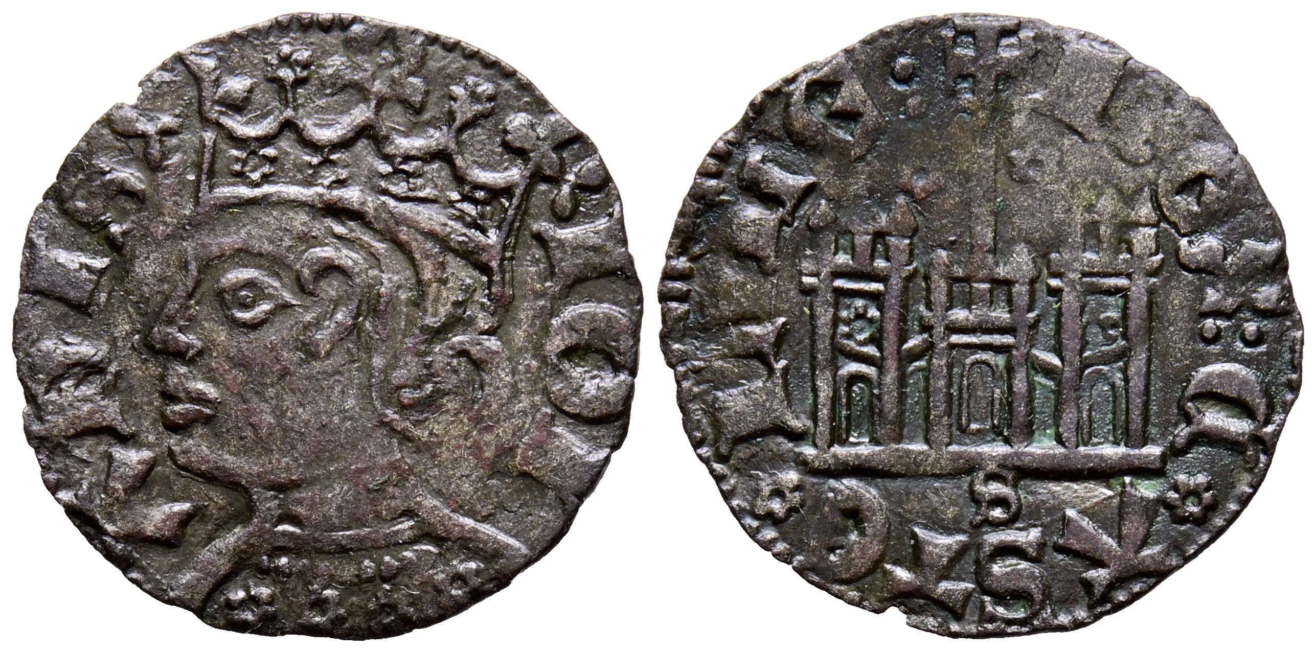 JUAN I (1379-1390). Cornado. (Ae. 0,70g/18mm). Sevilla. (FAB-573). Anv: Busto coronado de Juan I a izquierda, alrededor leyenda: IOHANES. Rev: Castillo con cruz sobre vástago central, entre dos flores, debajo S, alrededor leyenda: REX CASTELLE. MBC.
