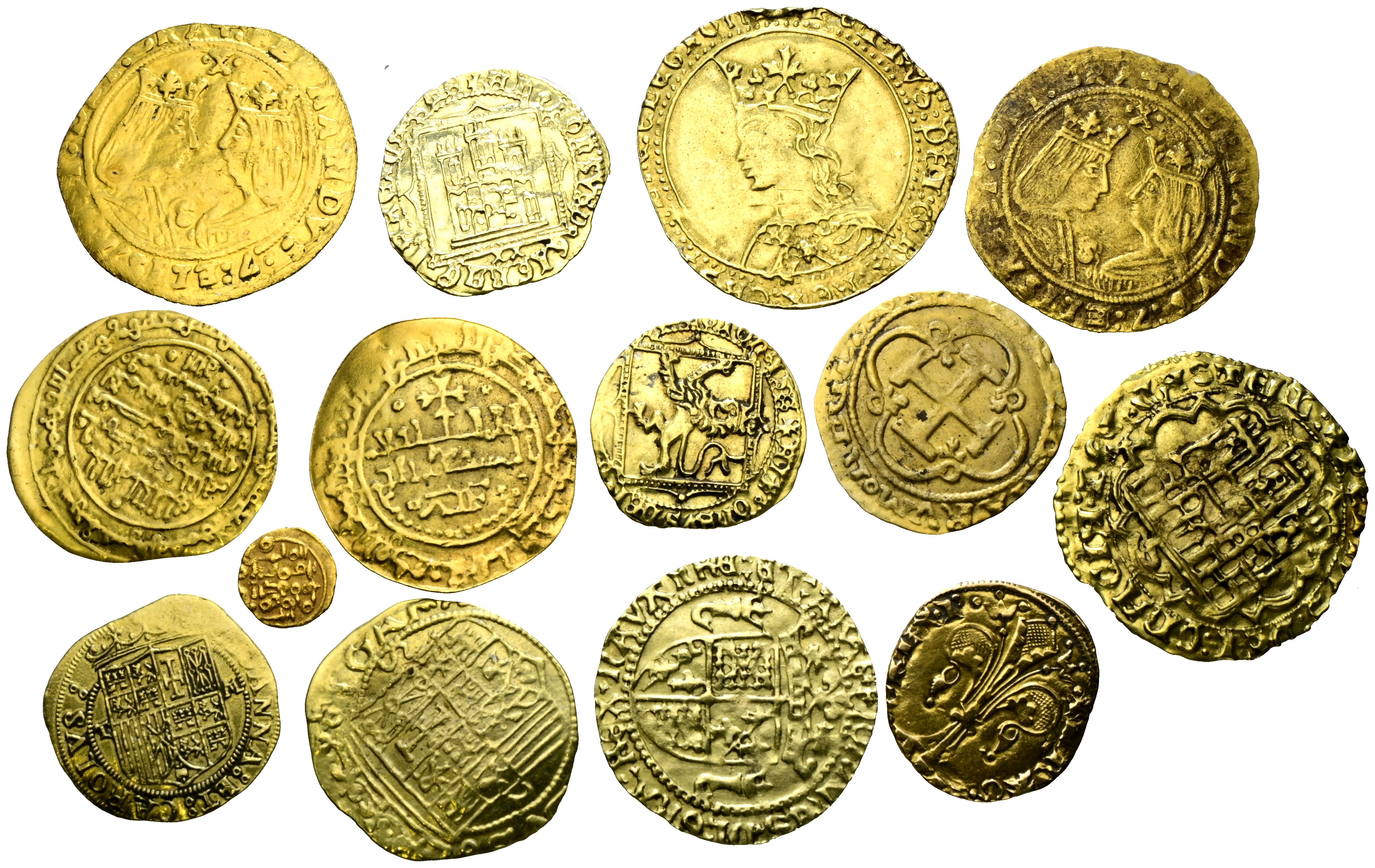 Conjunto de 16 reproducciones en oro de piezas medievales y monárquicas de distintos reyes y cecas. Peso total del conjunto: 52,38g. IMPRESCINDIBLE EXAMINAR.