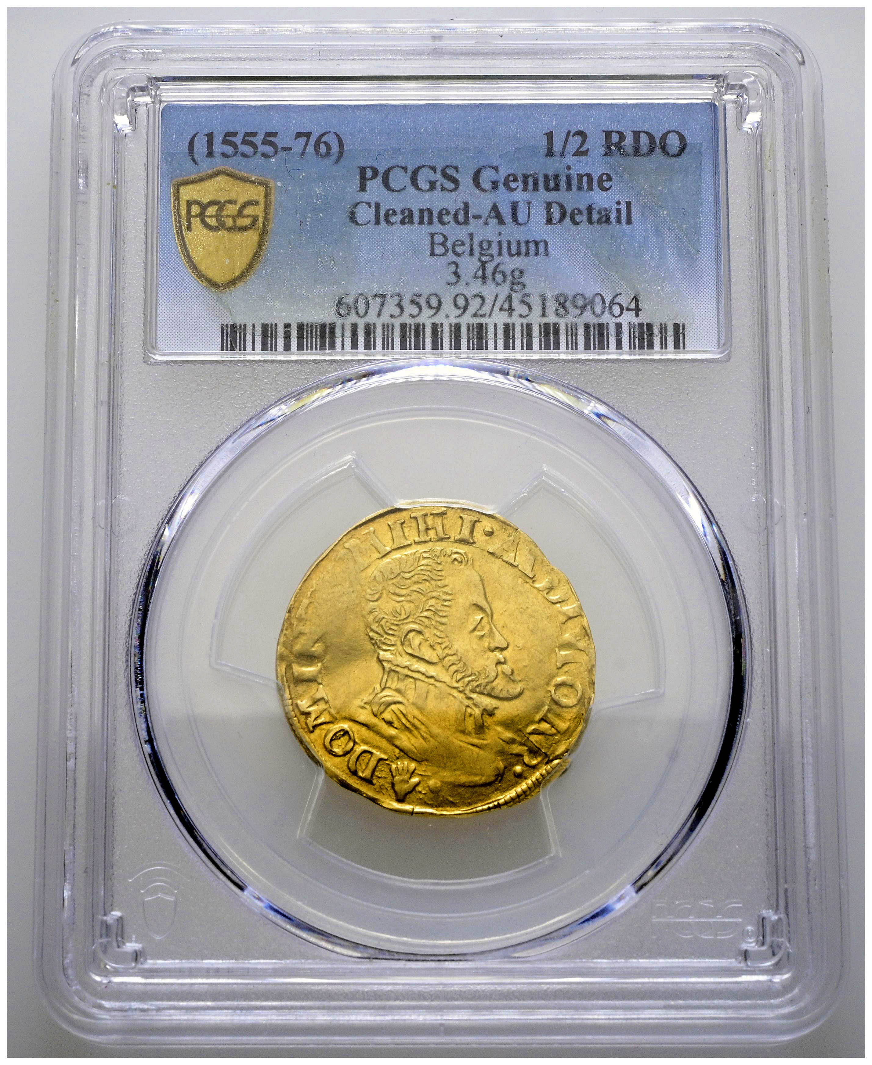 FELIPE II (1555-1598). 1/2 Real de Oro. (Au. 3,46g/23mm). S/D. Amberes. (Vicenti 1383). Encapsulada por PCGS AU Detail, Cleaned. Escasa.