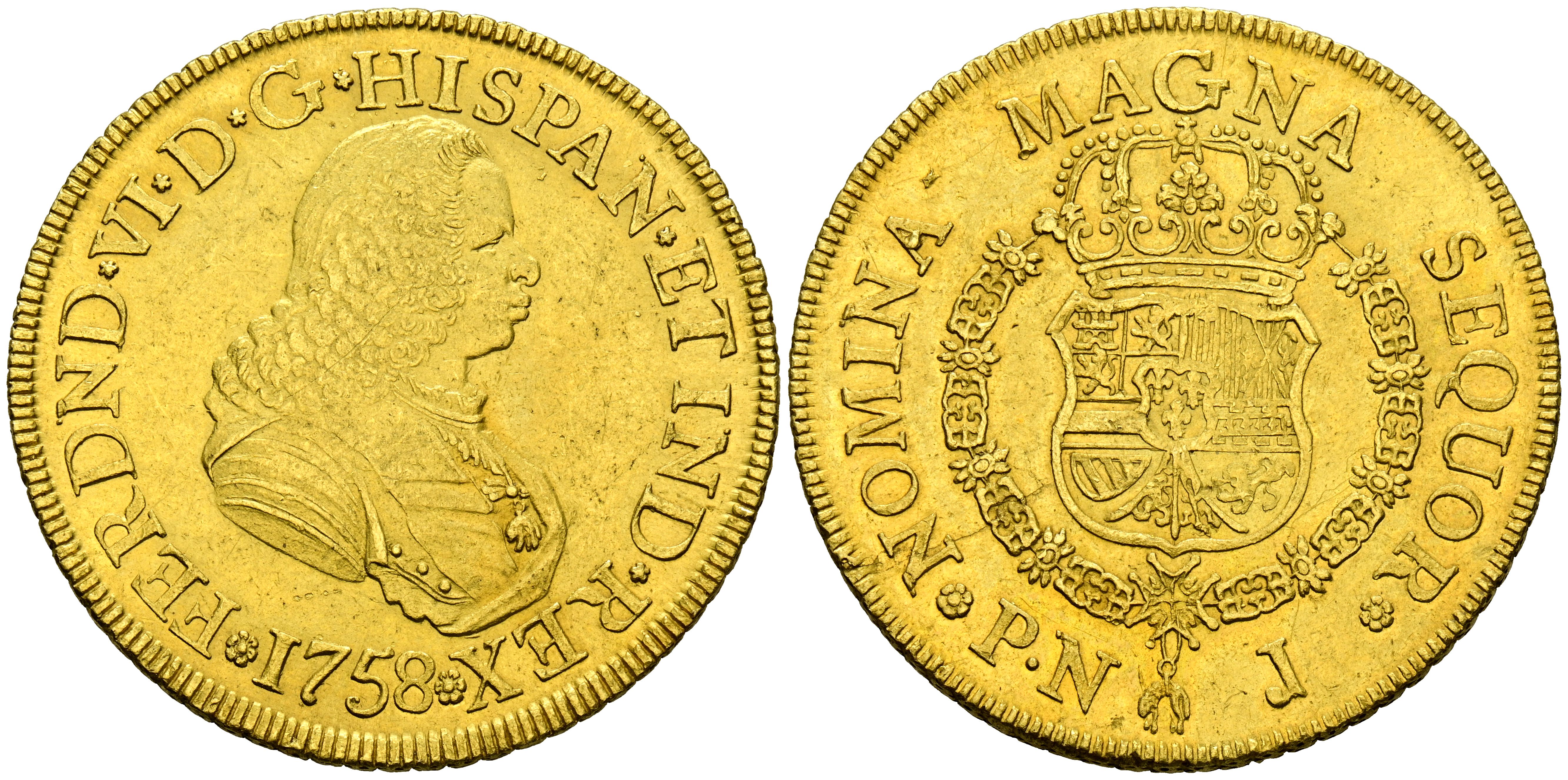 FERNANDO VI (1746-1759). 8 Escudos. (Au. 26,90g/38mm). 1758. Popayán J. (Cal-2019-796). Sin indicador de valor. EBC-. Marquitas en anverso. Escasa.