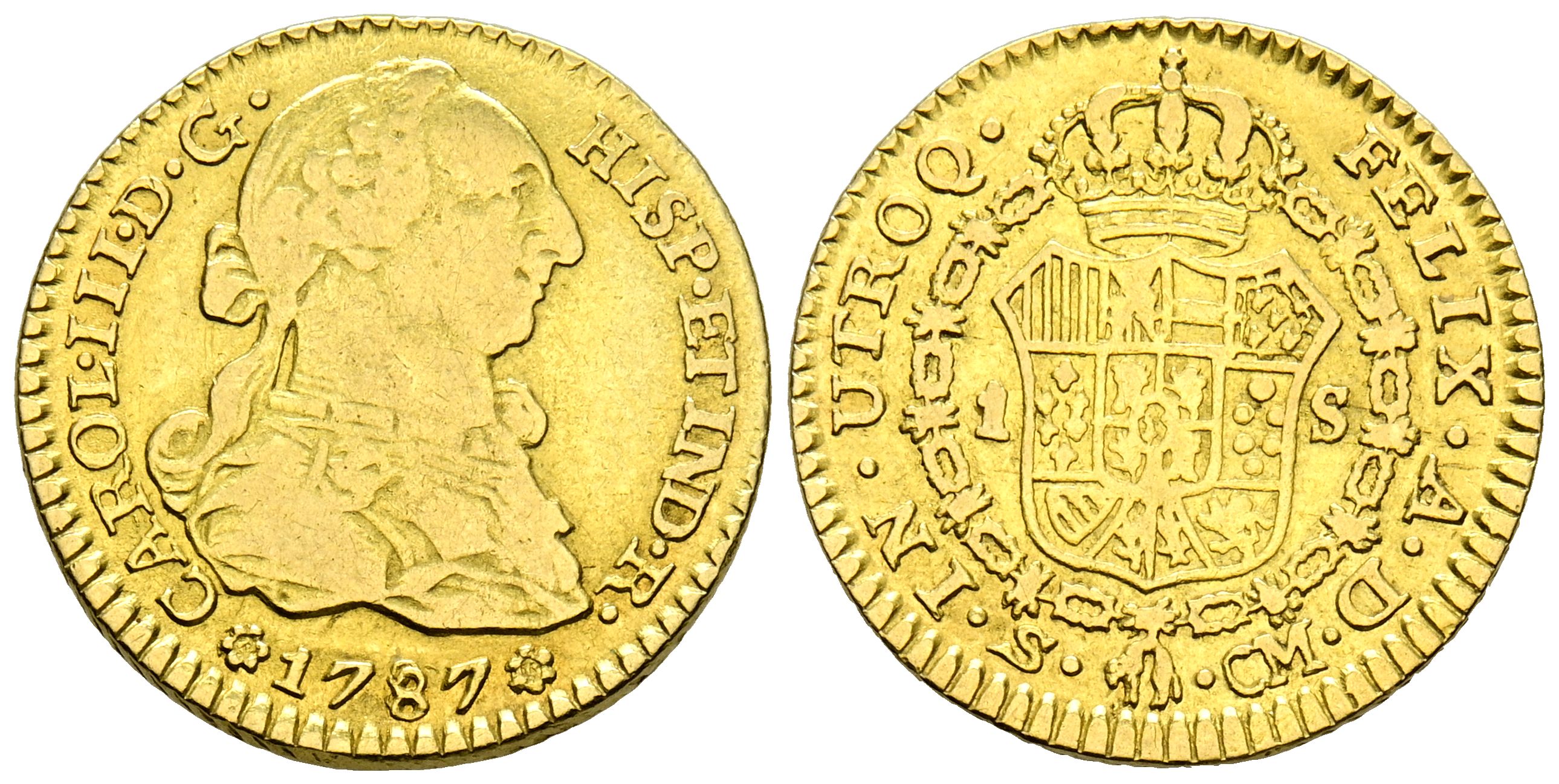 CARLOS III (1759-1788). 1 Escudo. (Au. 3,31g/18mm). 1787. Sevilla CM (Cal-2019-1505). MBC-/MBC.