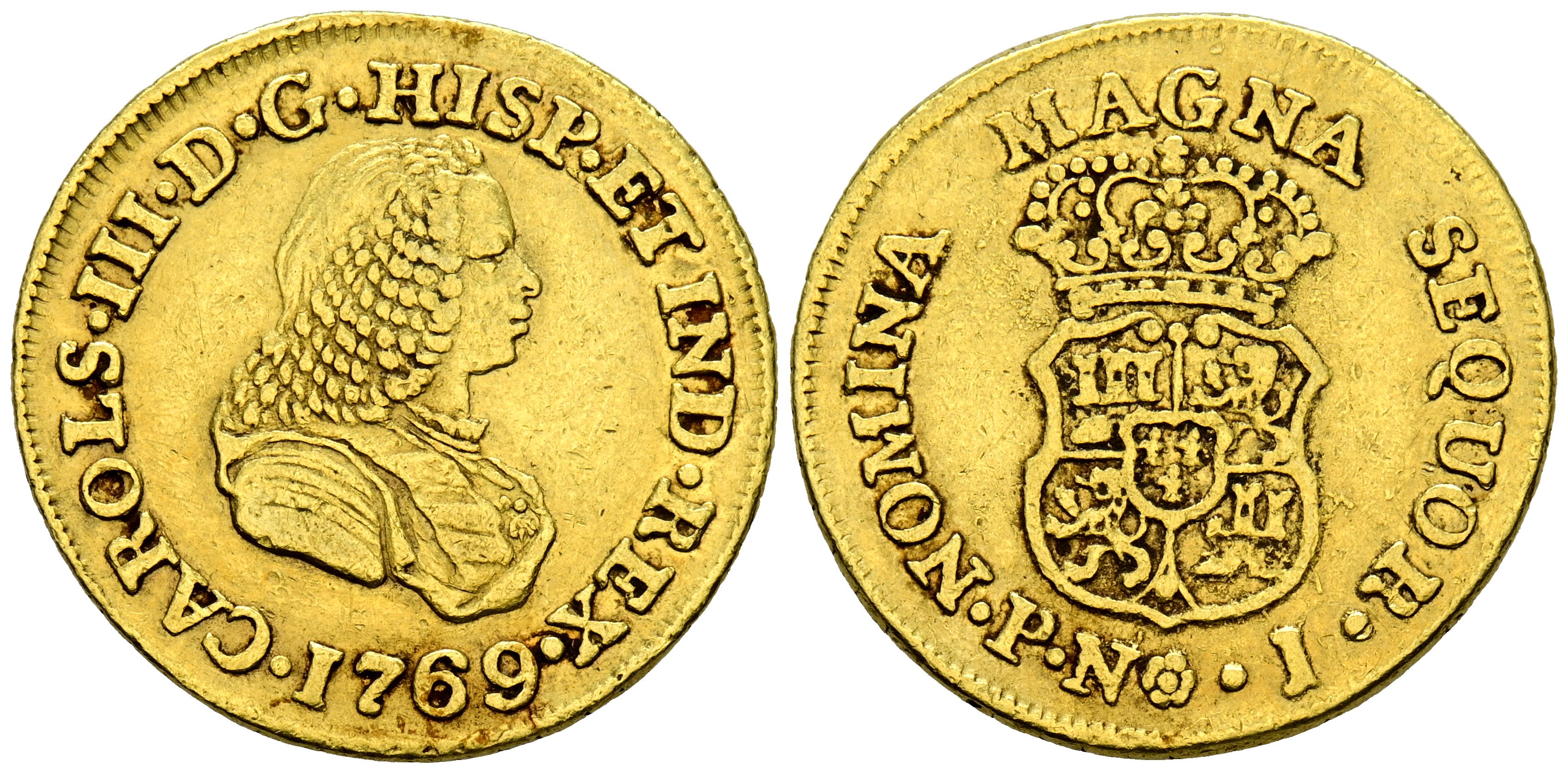 CARLOS III (1759-1788). 2 Escudos. (Au. 6,73g/24mm). 1769. Popayán J. (Cal-2019-1622). Busto de Fernando VI. Sin indicador de valor. MBC. Escasa.