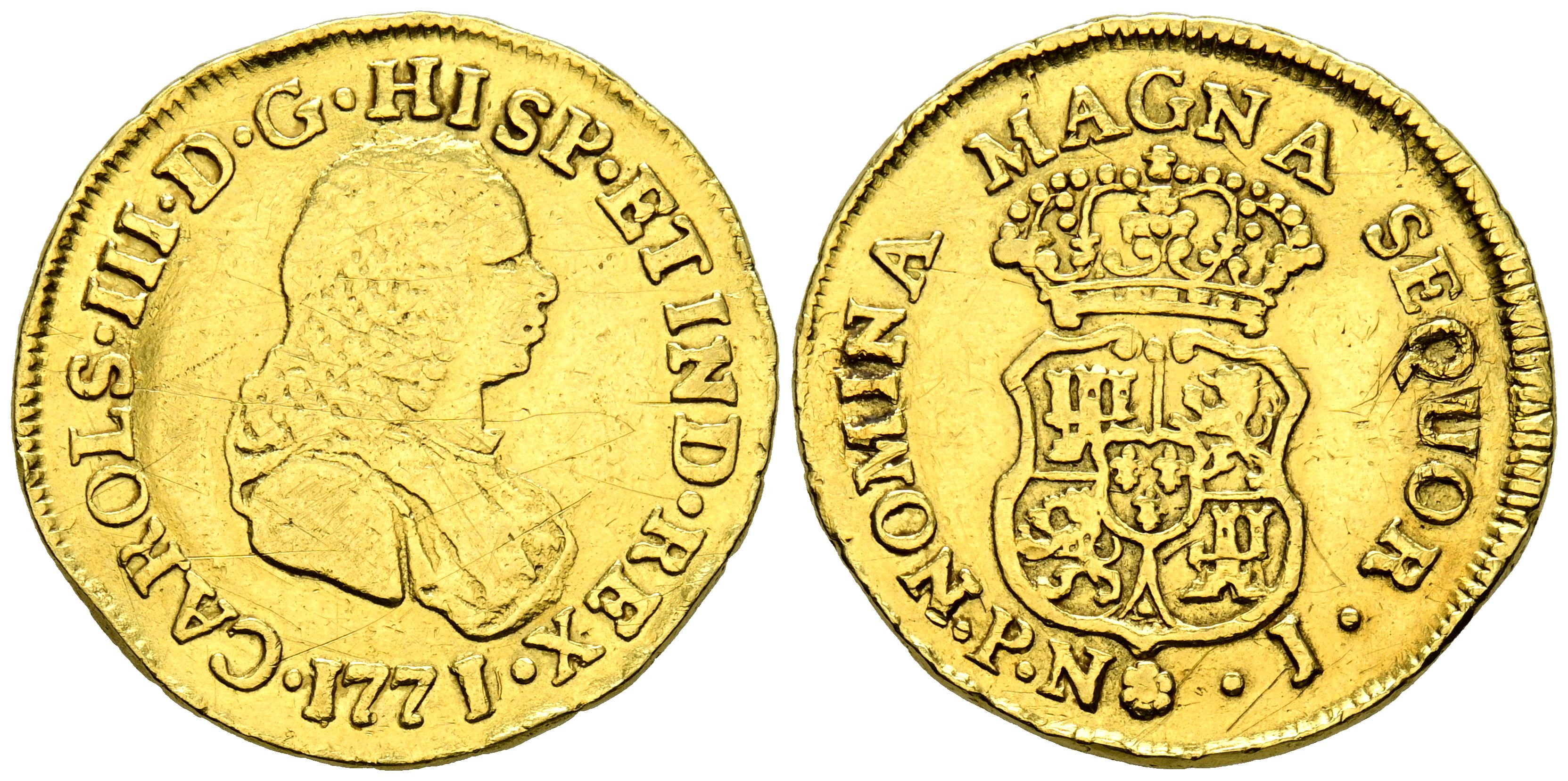 CARLOS III (1759-1788). 2 Escudos. (Au. 6,56g/24mm). 1771/0. Popayán J. (Cal-2019-1625). Último año de busto de Fernando VI. Sin indicador de valor. BC+ Usada como joya. Rara.