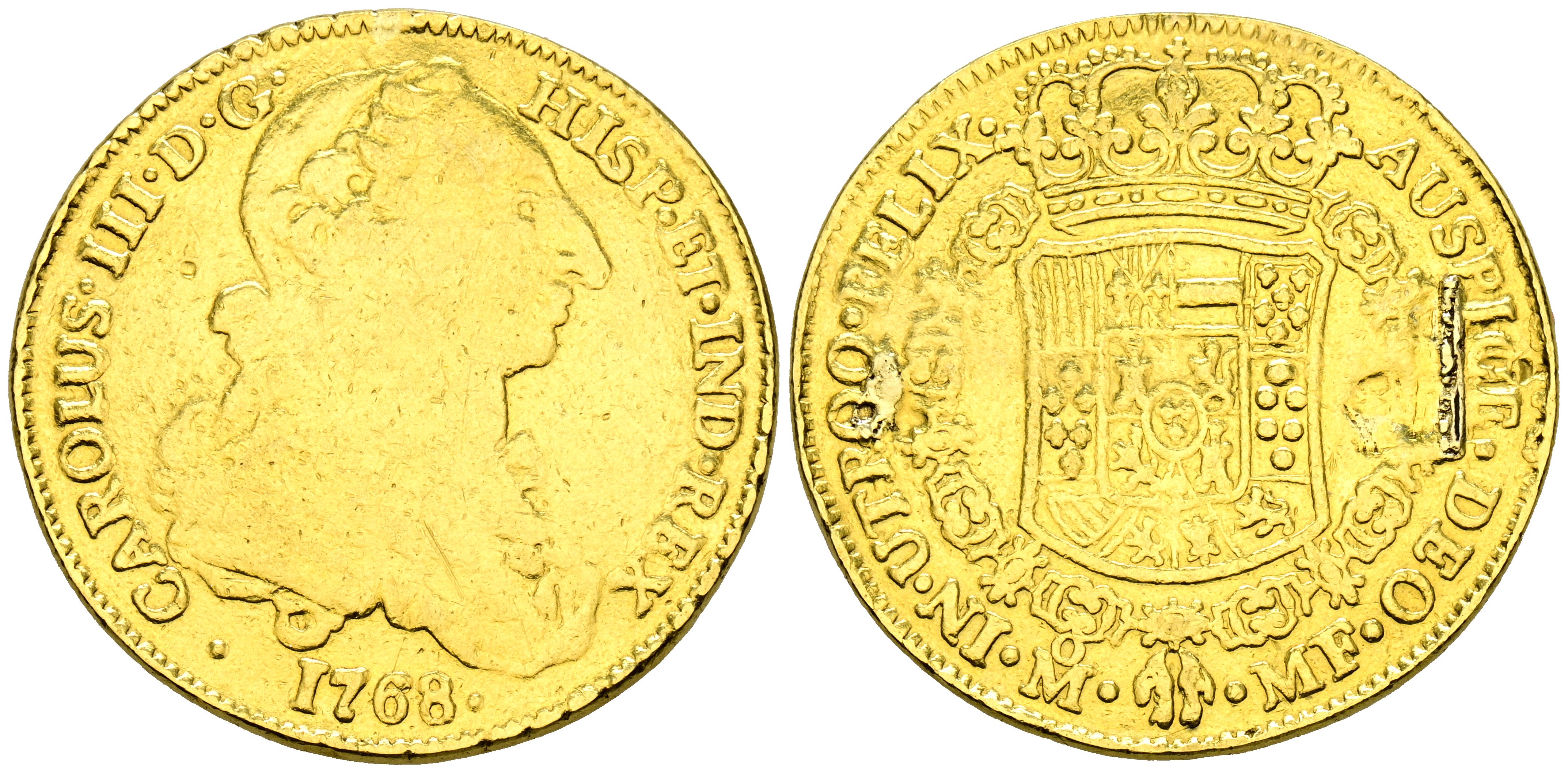 CARLOS III (1759-1788). 4 Escudos. (Au. 13,21g/30mm). 1768. México MF. (Cal-2019-1803). Tipo "cara de rata". BC+. Usada como joya. Restos de soldadura en reverso. Rarísima.Ex Aureo & Calicó, Subasta 355 (Colección Fleming, vol. II), 19/11/2020. Nº Lote 1960.
