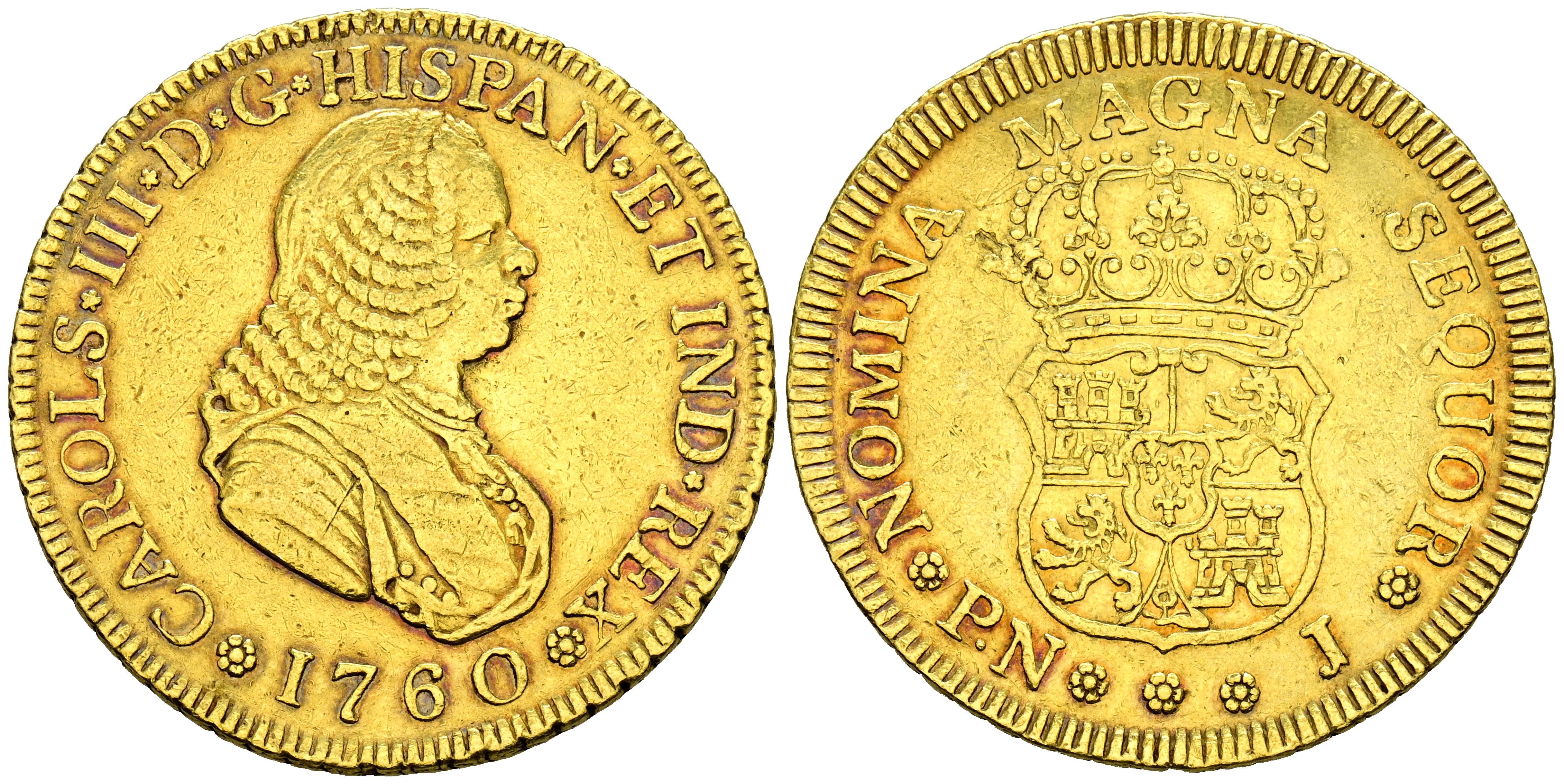 CARLOS III (1759-1788). 4 Escudos. (Au. 13,39g/32mm). 1760. Popayán J. (Cal-2019-1830). Busto de Fernando VI. Sin indicador de valor. MBC+. Rara. Restos de brillo original.