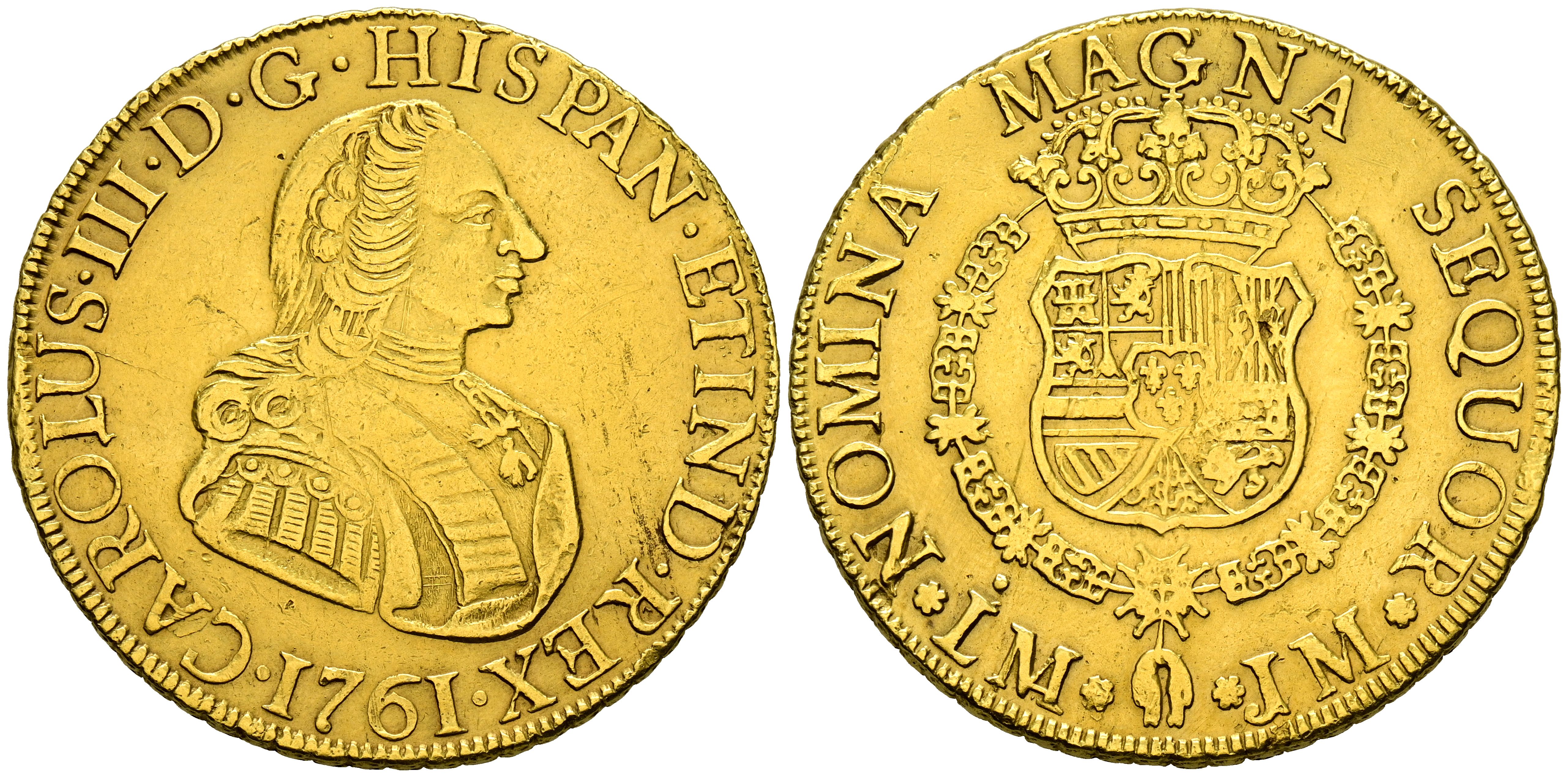 CARLOS III (1759-1788). 8 Escudos. (Au. 26,85g/36mm). 1761. Lima JM. (Cal-2019-1914). Primer busto. MBC+. Limpiada. Rara.