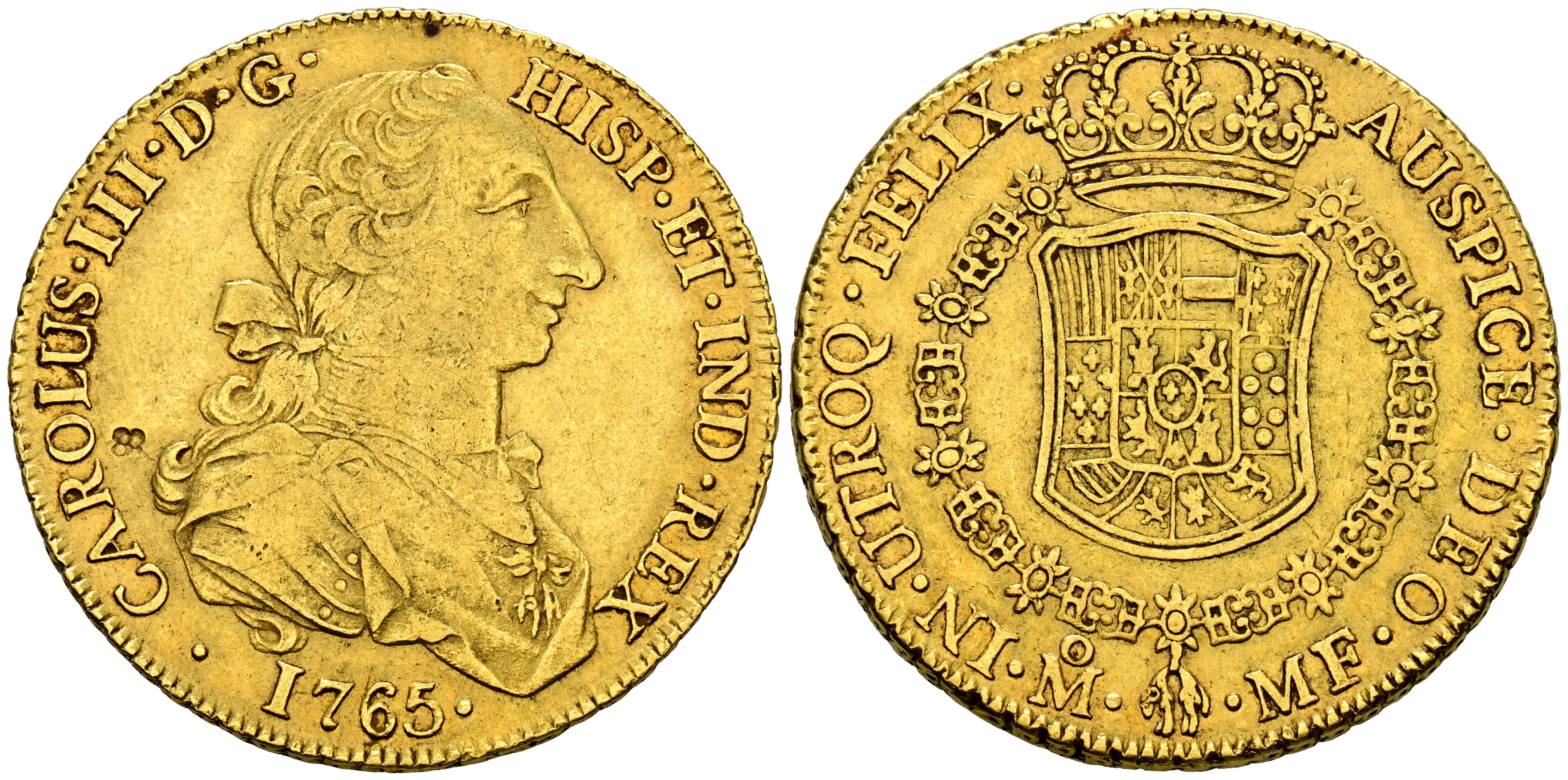 CARLOS III (1759-1788). 8 Escudos. (Au. 26,97g/35mm). 1765. México MF. (Cal-2019-1989). Tipo "cara de rata". MBC. Contramarca de 4 roeles en anverso. Rara.Entre 1762 y 1772 y hasta en siete cecas diferentes se acuñan estas emblemáticas monedas cuyo busto es obra de Tomás Francisco Prieto. En el caso de la ceca de México los últimos ejemplares salieron de sus talleres un año antes, en 1771, y podemos encontrarlas con dos marcas de ensayadores diferentes MM y MF. Además y para esta ceca se distinguen, también, dos tipos de bustos cara de rata diferentes (aunque en el primero de ellos encontramos otro subtipo: los que tienen el toisón a derecha de la fecha y las que la tienen sobre el pecho).