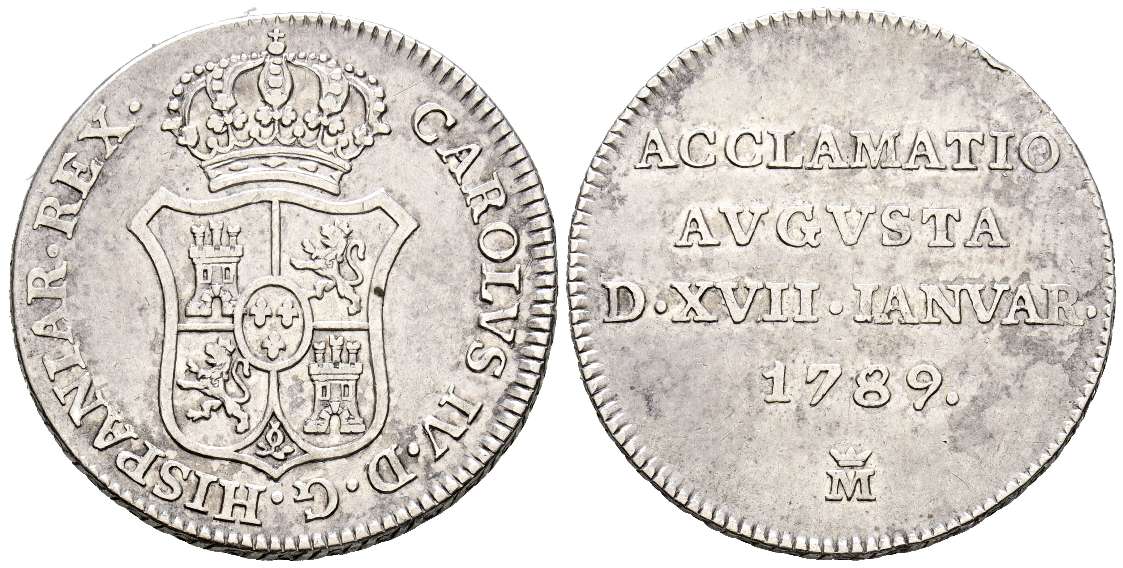 CARLOS IV (1808-1833). Proclamación en Madrid. (Ar. 6,03g/26mm). 1789. Módulo de 2 Reales. (Ha.65). MBC+.