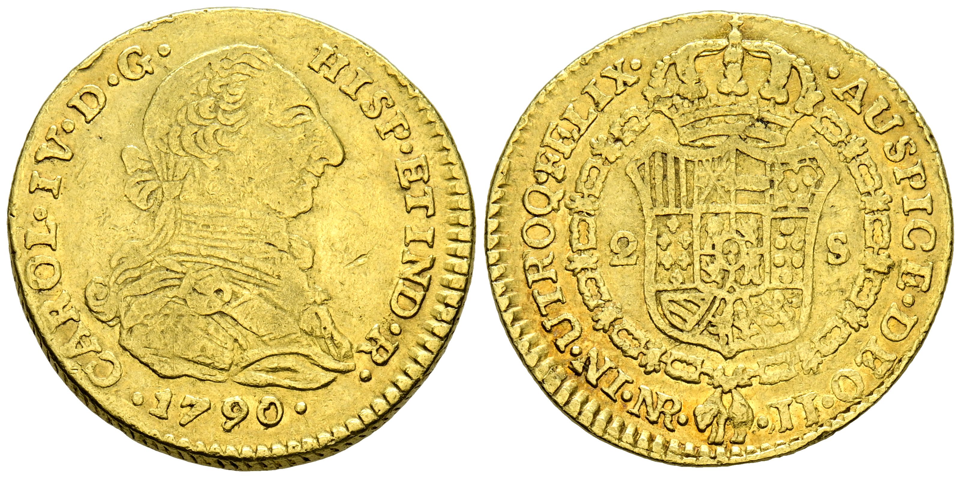 CARLOS IV (1788-1808). 2 Escudos. (Au. 6,70g/22mm). 1790/89. Santa Fe de Nuevo Reino. (Cal-2019-1381). Busto de Carlos III y ordinal IV. MBC-. Escasa.
