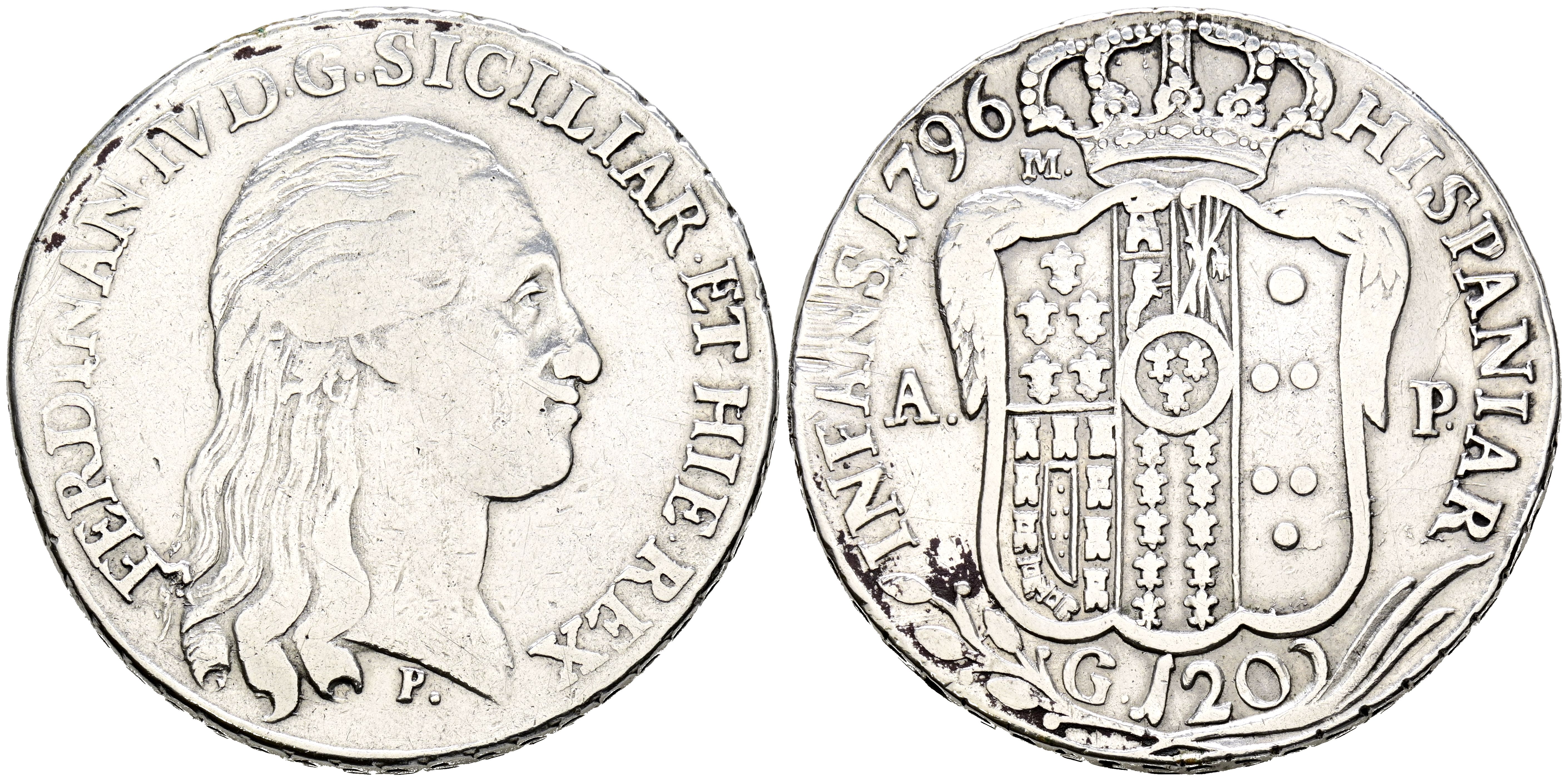 FERNANDO DE DOS SICILIAS (1759-1825). Piastra (120 Grana). (Ar. 27,20g/40mm). 1796. Nápoles M/AP. Infante de España y hermano de Carlos IV. (Vicenti 298). MBC. Limpiada.