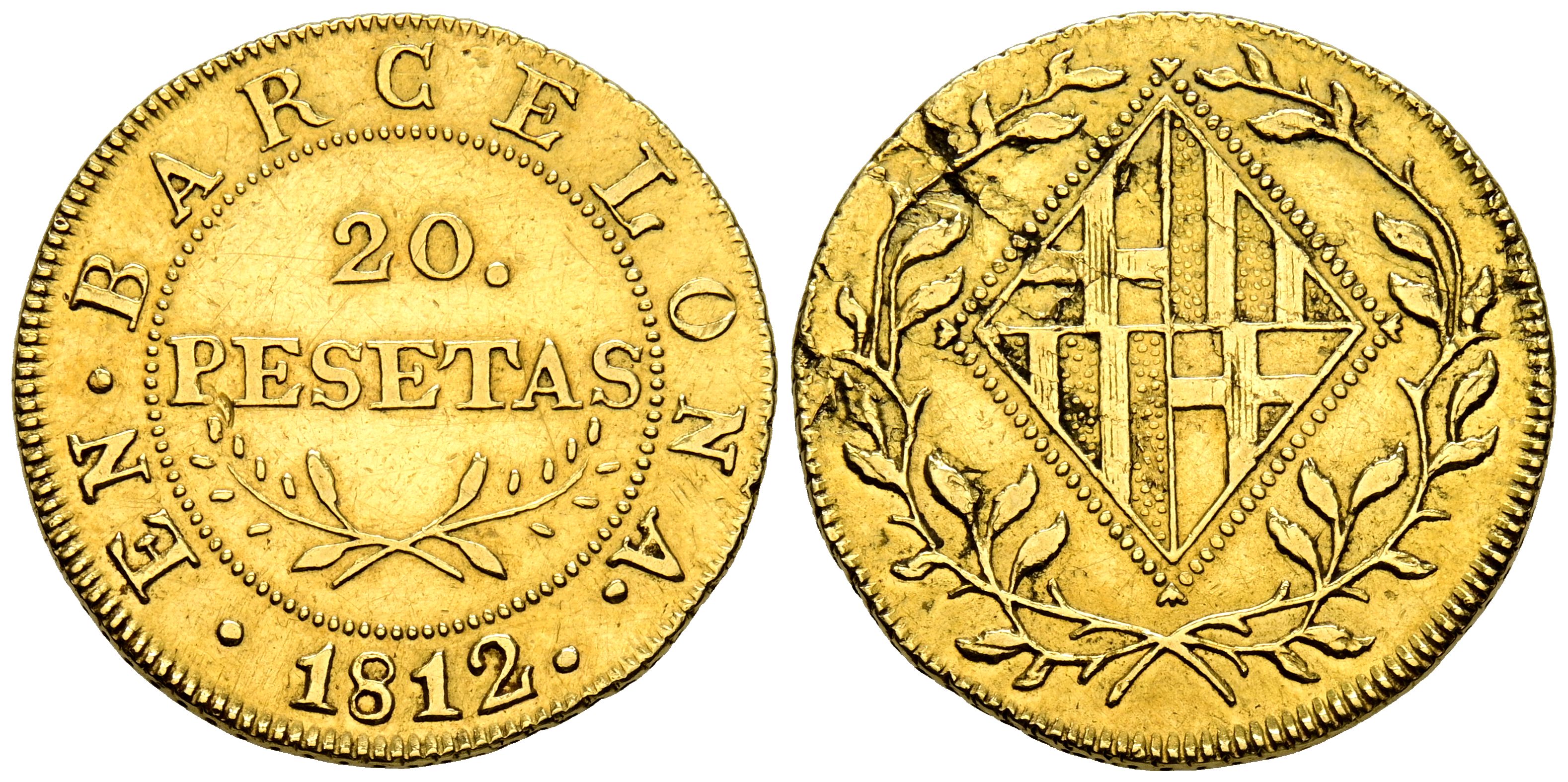 CATALUÑA NAPOLEÓNICA (1808-1814). 20 Pesetas. (Au. 6,69g/22mm). 1812. Barcelona. (Cal-2019-54). MBC+. Hojitas, especialmente en reverso.Desde 1808 y hasta 1814 (fecha efectiva de la marcha de las tropas francesas de Cataluña), se habían acuñado piezas en cobre, la gran mayoría de las acuñaciones son en este metal (4 Cuartos y divisores), plata (1, 2 ½ y 5 Pesetas) y oro (20 Pesetas). Los estilos de las piezas recuerdan claramente a las monedas francesas del Consulado y todas tienen en común el tener el escudo laureado de Barcelona en los reversos. La peseta se convierte, de este modo, en la moneda oficial catalana. Unos años más tarde fue recuperada por Isabel II, para todo el país, en plena I Guerra Carlista (1836) para pagar a sus soldados en suelo catalán (los famosos peseteros) para terminar convirtiéndose, hacia 1869, y bajo el Gobierno Provisional en moneda oficial del Estado Español.