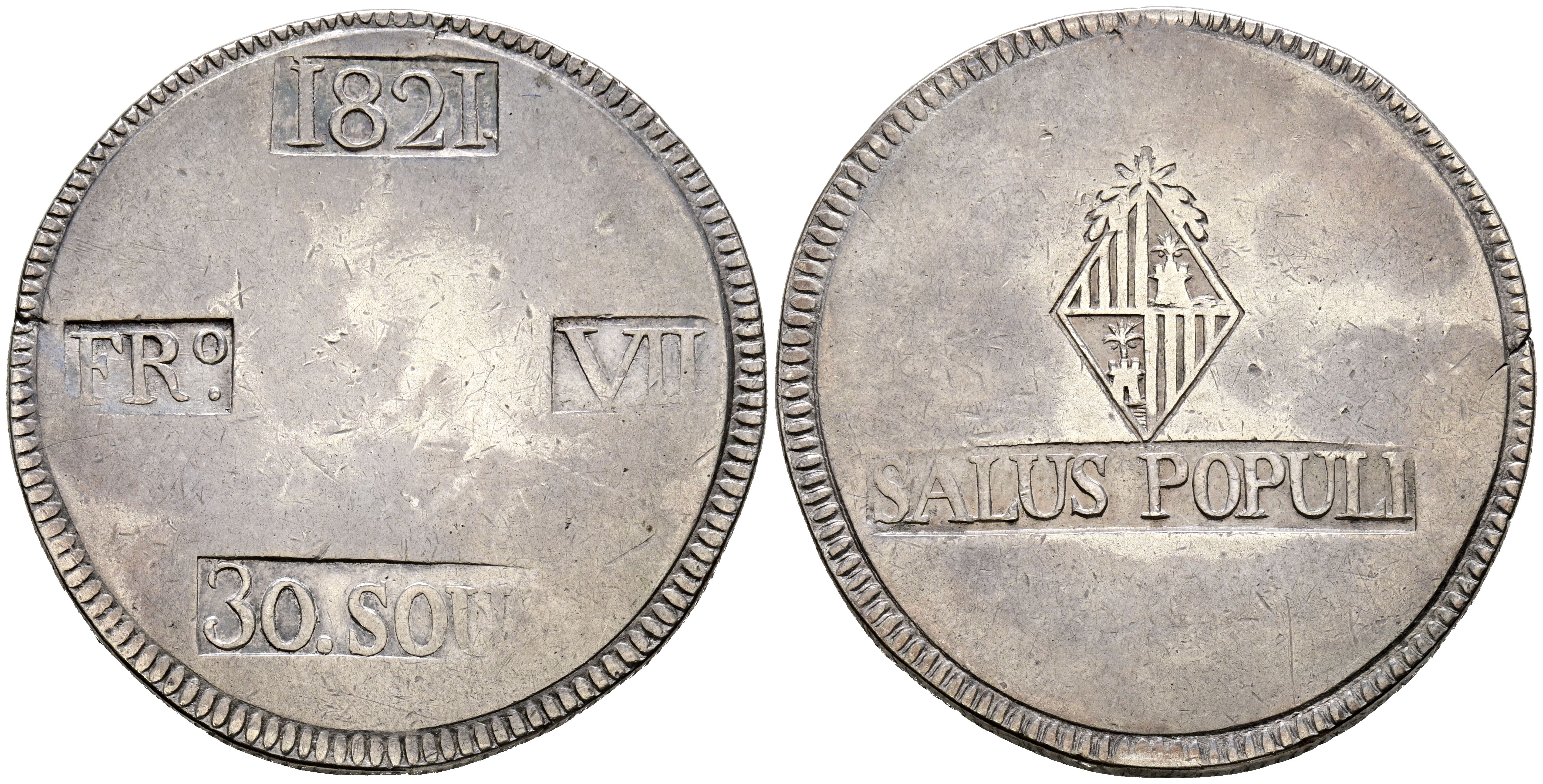 FERNANDO VII (1808-1833). 30 Sous. (Ar. 26,61g/41mm). 1821. Mallorca. (Cal-2019-1293). MBC+.