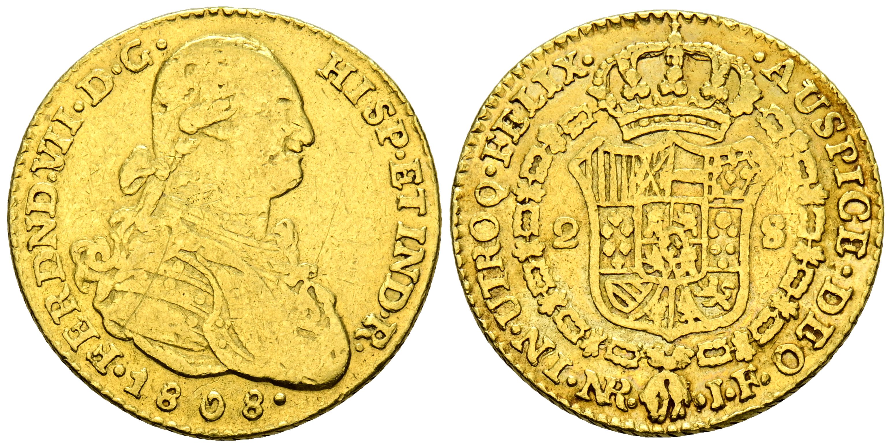 FERNANDO VII (1808-1833). 2 Escudos. (Au. 6,12g/22mm). 1808. Santa Fe de Nuevo Reino JF. (Cal-2019-1654). MBC-. Muy rara.