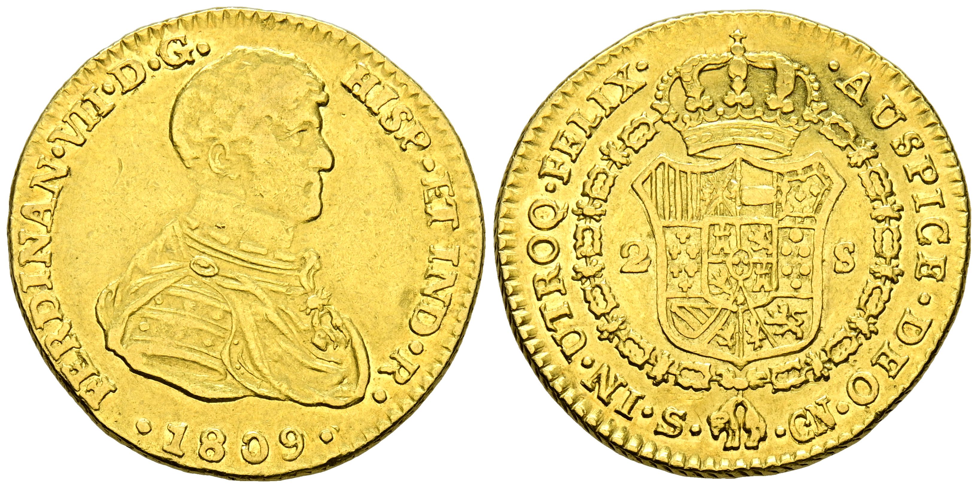 FERNANDO VII (1808-1833). 2 Escudos. (Au. 6,73g/23mm). 1809. Sevilla CN. (Cal-2019-1667). Primer busto. MBC/MBC+.