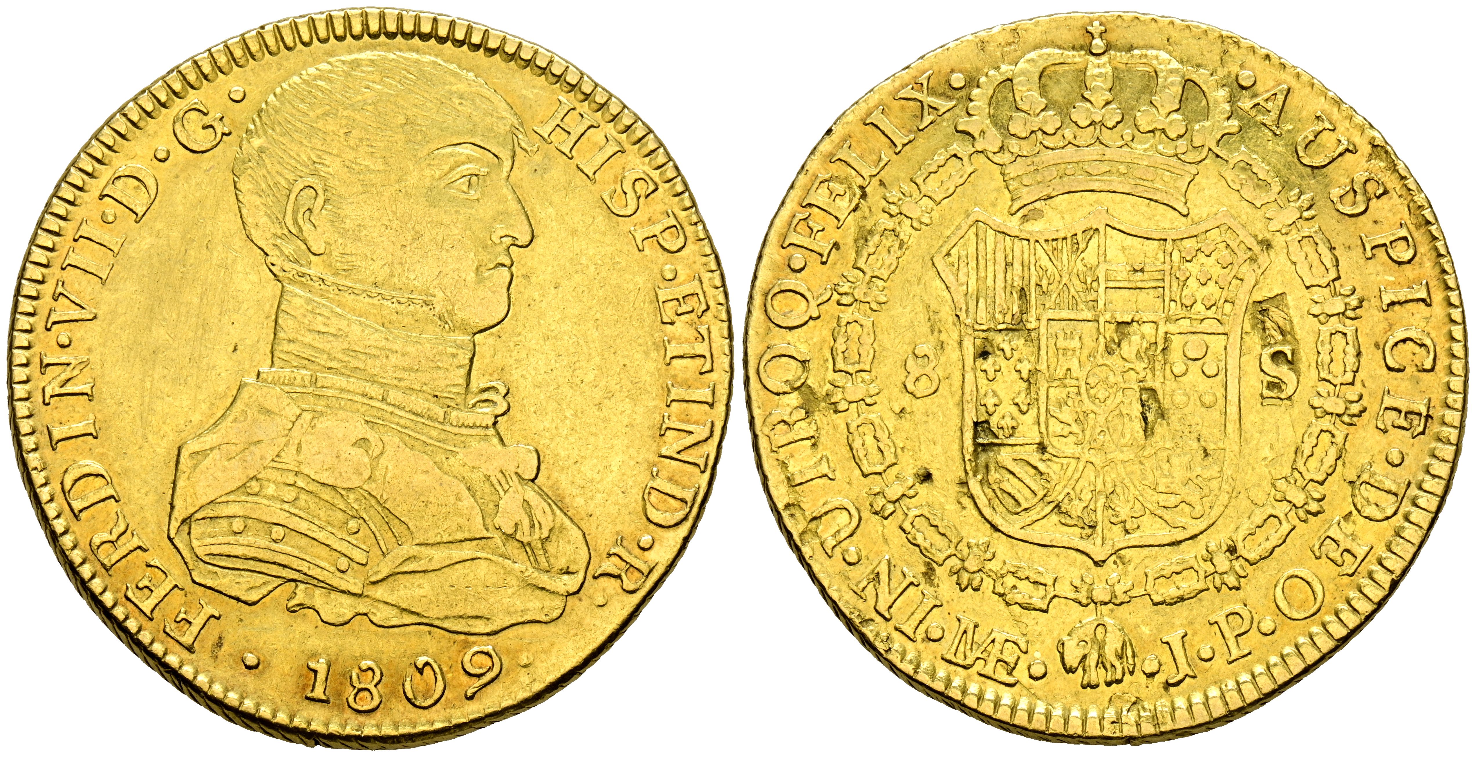 FERNANDO VII (1808-1833). 8 Escudos. (Au. 26,78g/36mm). 1809. Lima JP. (Cal-2019-1754). Busto Indígena. EBC-. Pequeñas hojitas en reverso.