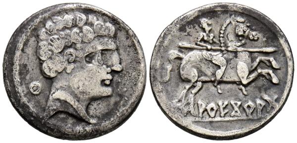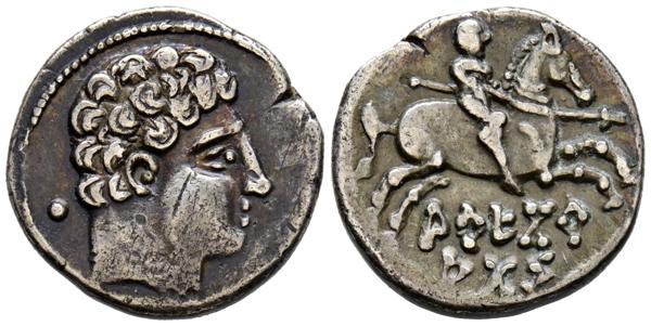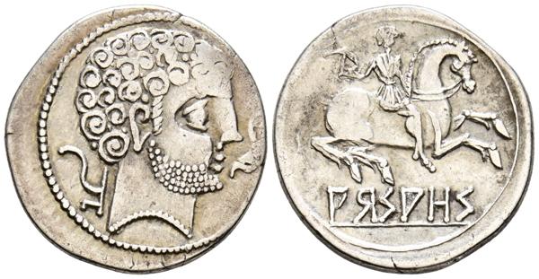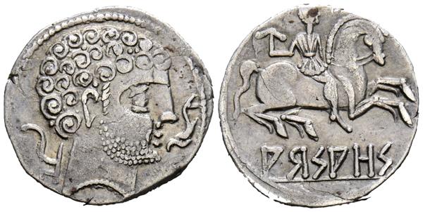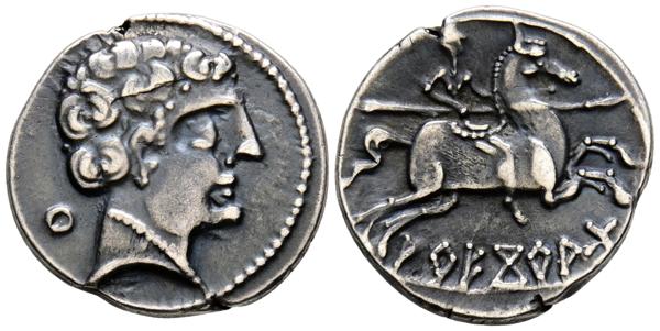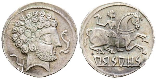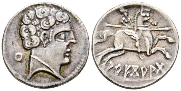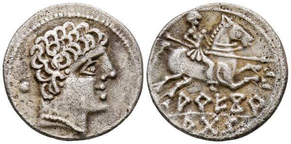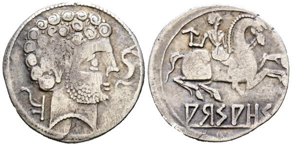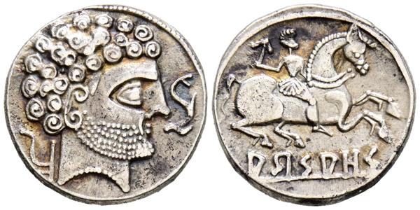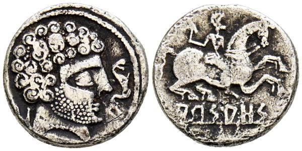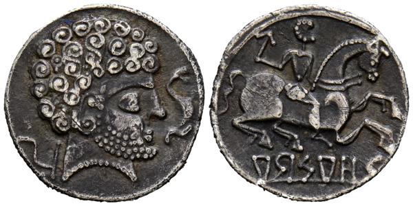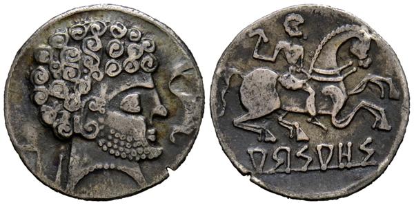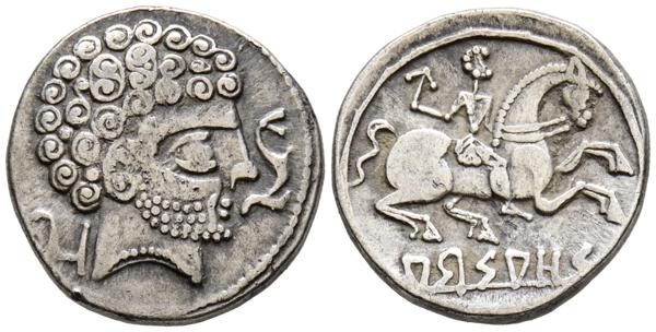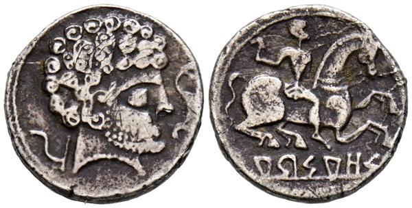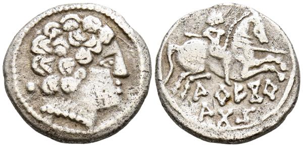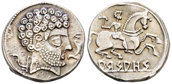 ARSAOS (Zona de Navarra). Denario. (Ar. 3,82g/18mm). 120-80 a.C. (FAB-139). Anv: Cabeza masculina barbada a derecha, delante delfín, detrás arado. Rev: Jinete con dardo a derecha, debajo leyenda ibérica sobre línea: ARSAOS. MBC+. Ex Jesús Vico, Colección Viriato (14/10/2021), Nº Lote 1042. Ex Jesús Vico (03/03/1993), Nº Lote 31.